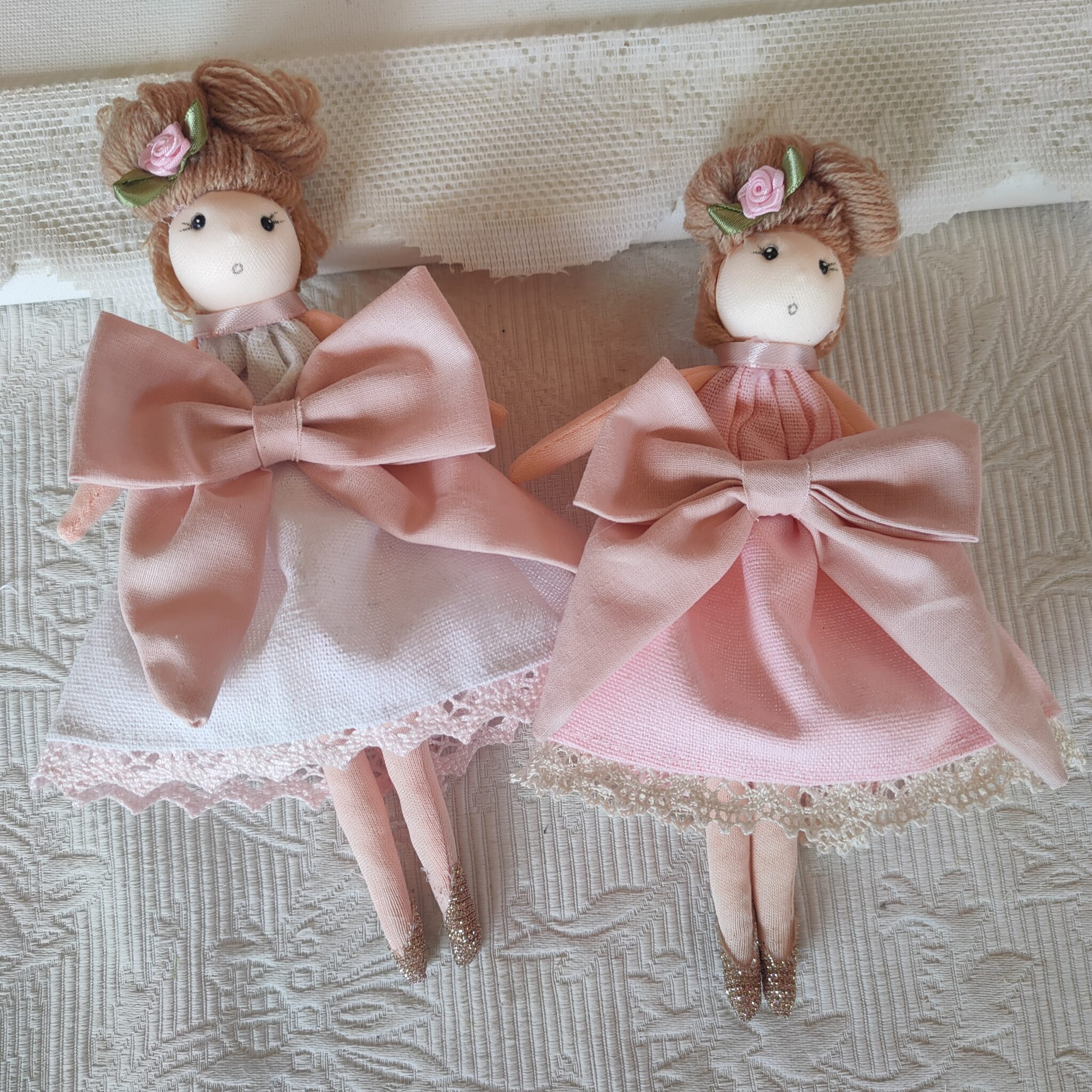 Bomboniera Comunione e Cresima, bambola in stoffa con vestitino rosa e bianco decorato con fiocco e fiorellino in testa, cm 19.