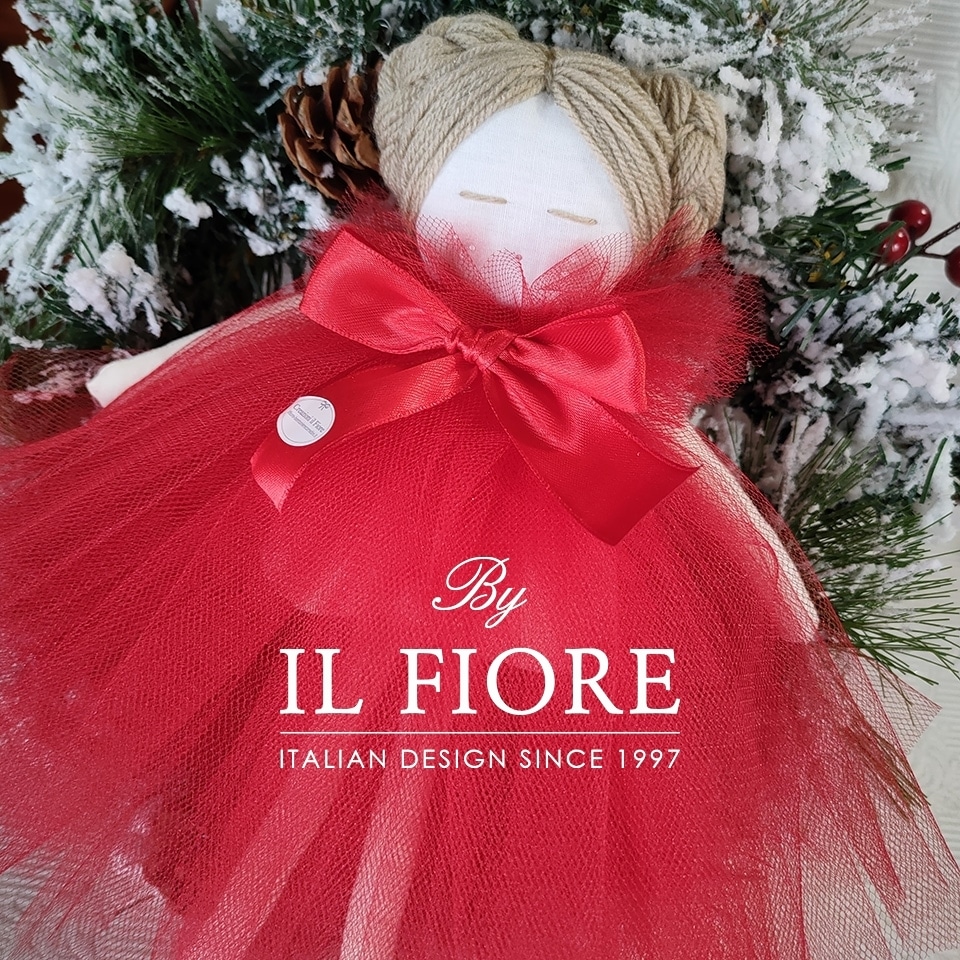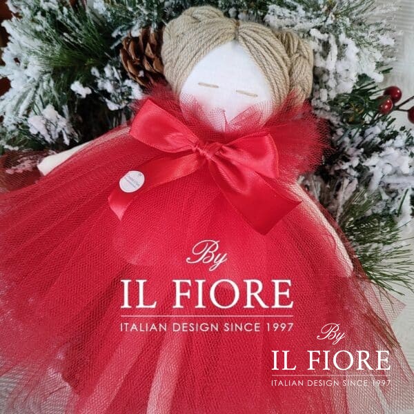 Bambola NATALIZIA in stoffa, ideale come angelo per albero di Natale o come splendido regalo. La bombola in stoffa ha un ampio abito in tulle rosso e fiocco di raso. Confezione regalo con sacchetto in organza.