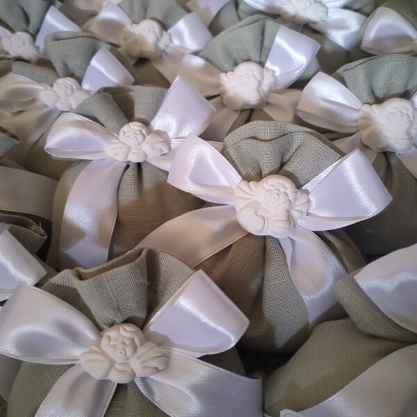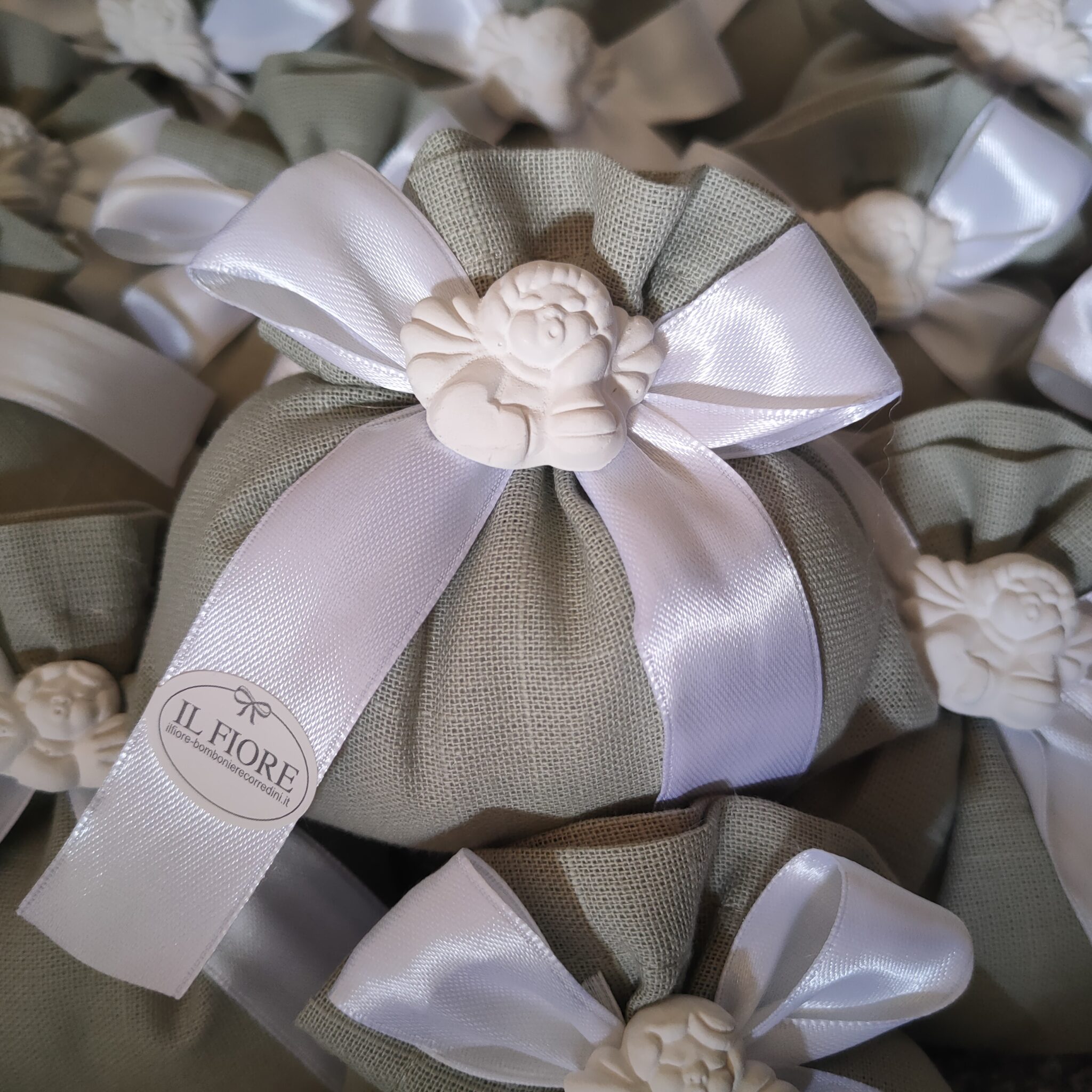 Bomboniera Comunione e Cresima, sacchetto verde salvia con angioletto in gesso profumato.