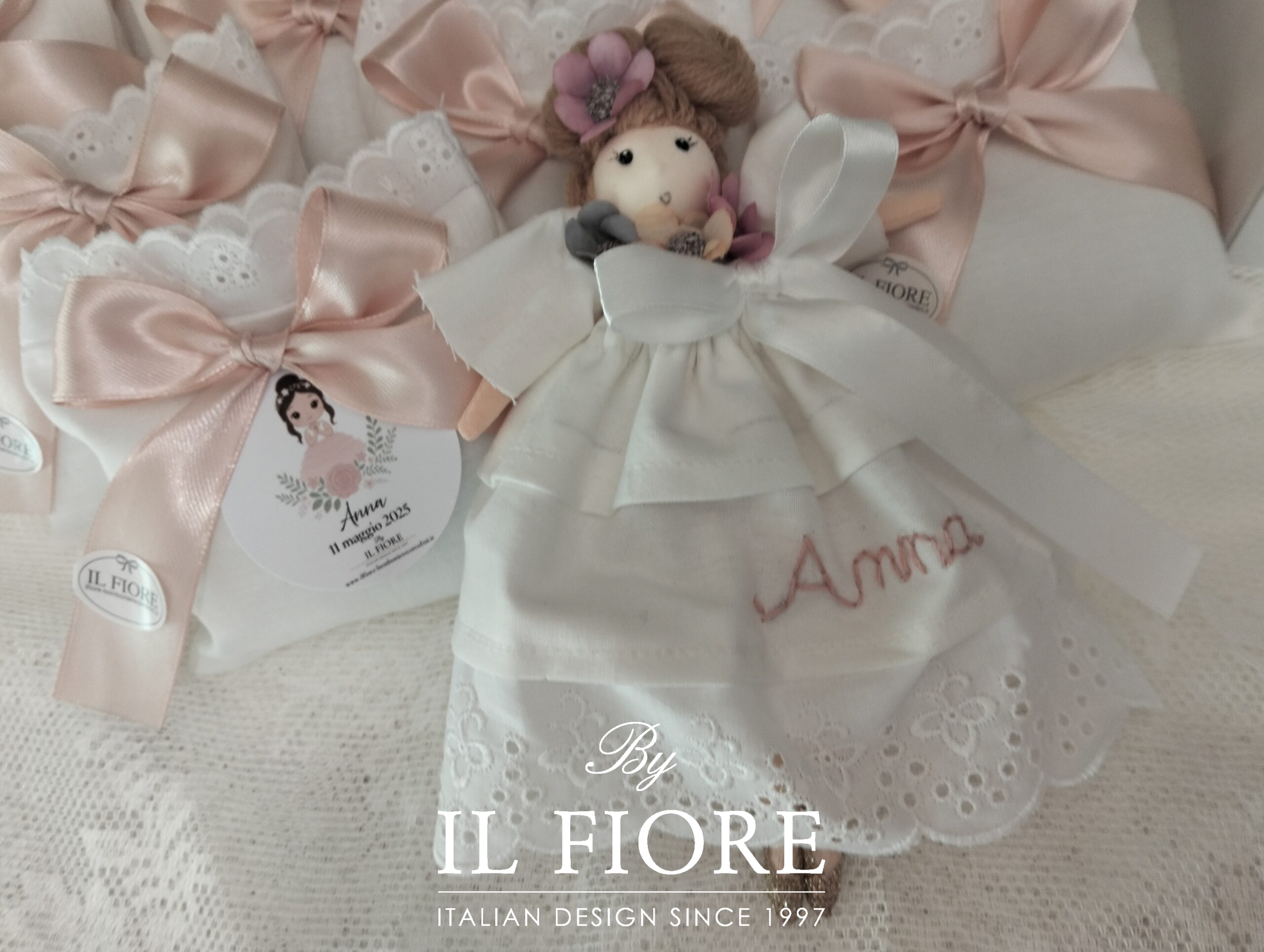 Bomboniera Battesimo, bambola decorata con fiori e vestito con nome ricamato a mano. I NOMI  CON  PIU’ DI 4 LETTERE COSTA € 0,60 IN PIU’.
