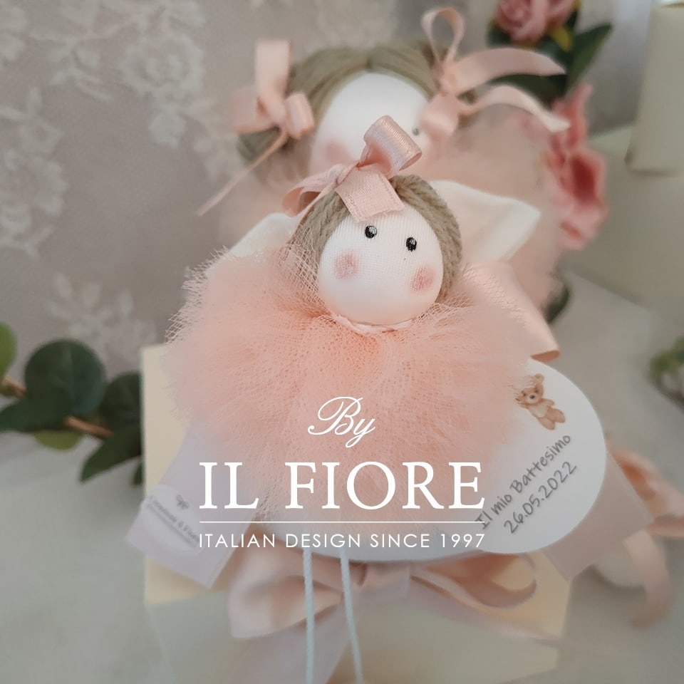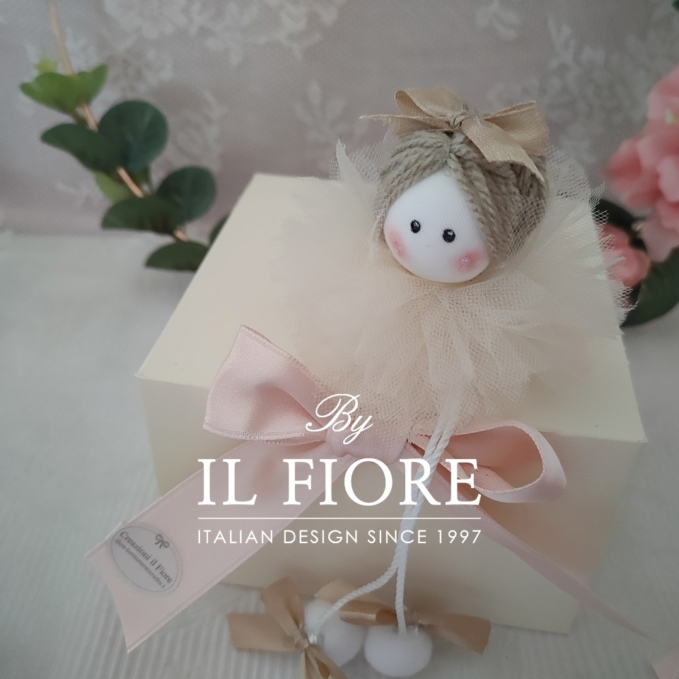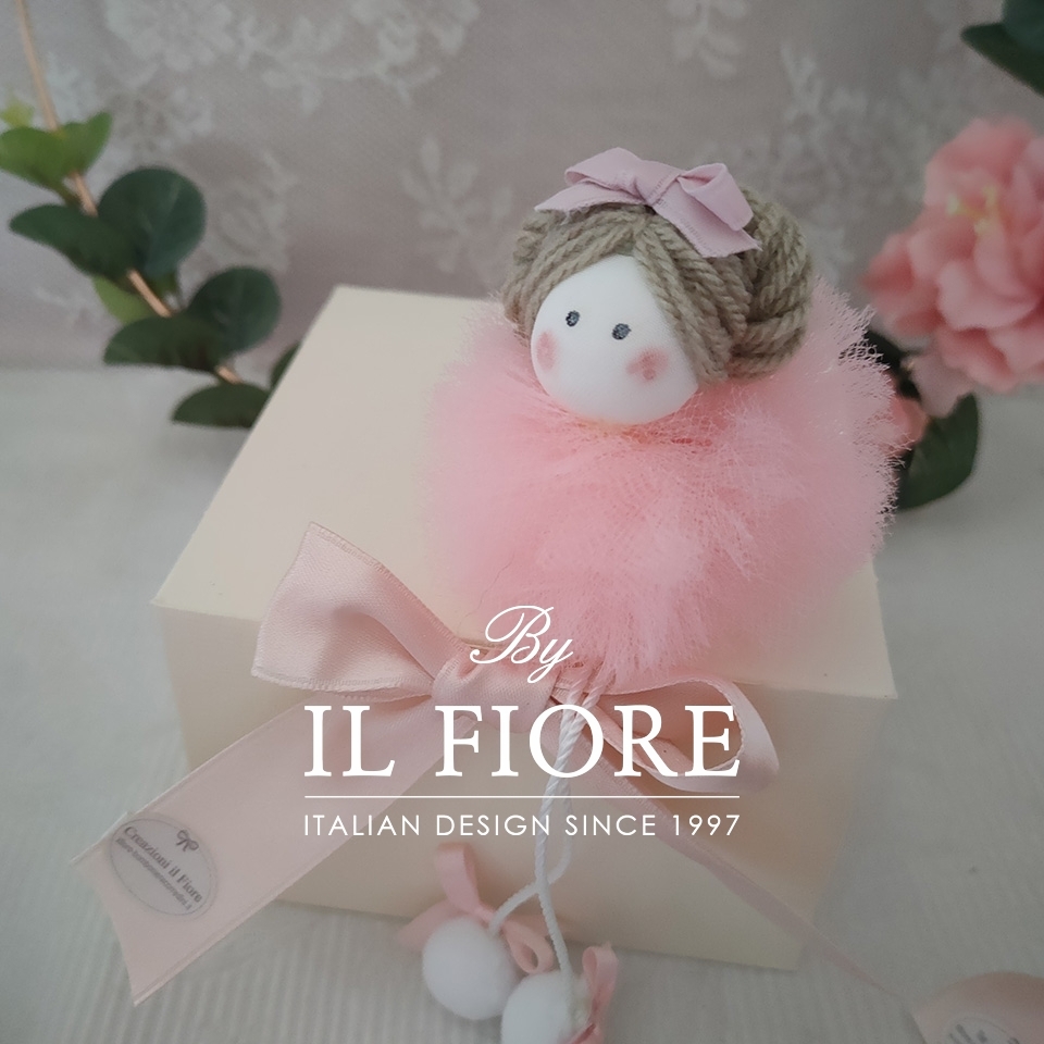 Bomboniera Battesimo, bambola in tulle, confezionata con sacchetto, fiocco di raso, confetti alla mandorla e bigliettino in omaggio.