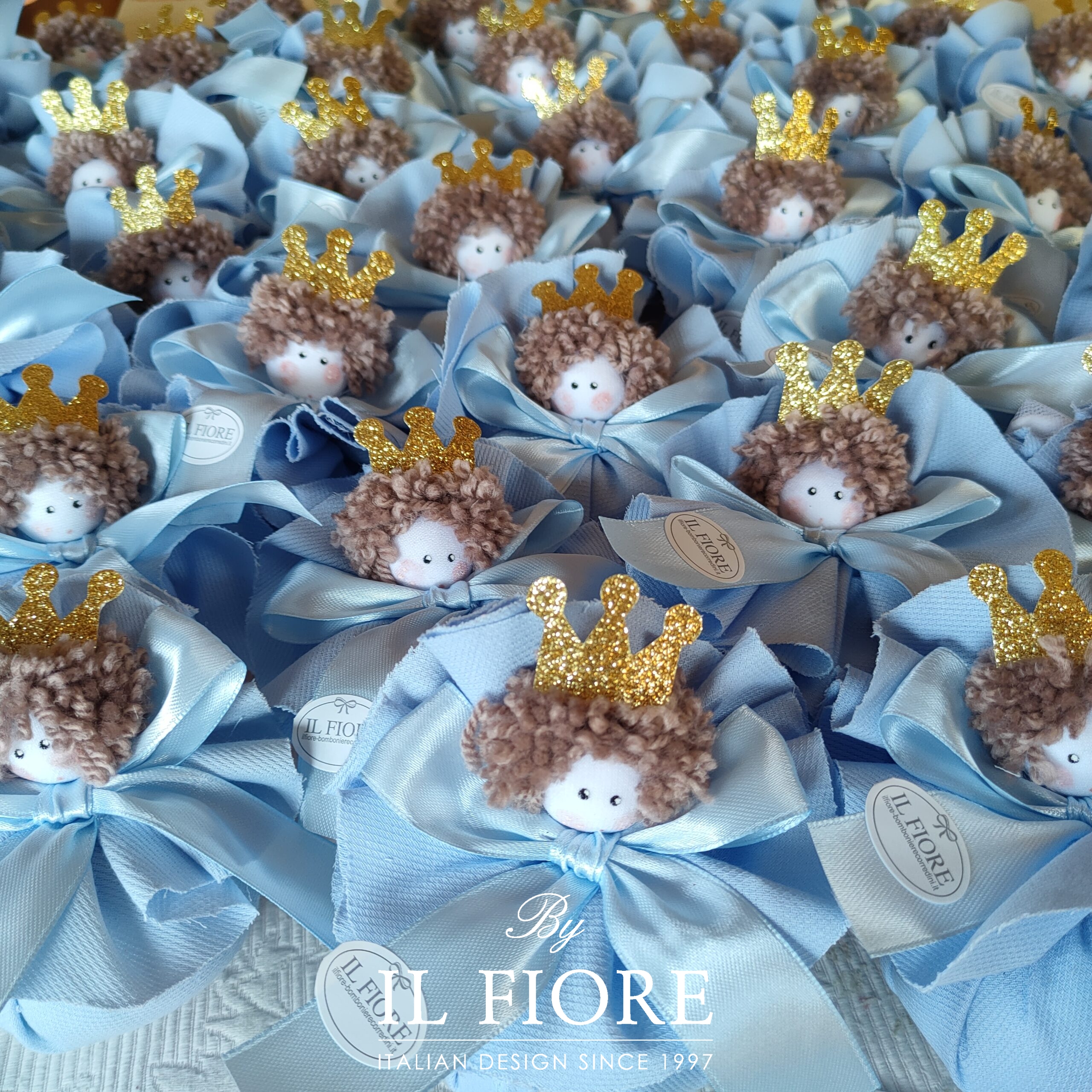 Bomboniera bambola principessa e principino per Battesimo. Le bombole pouf sono realizzate interamente a mano  in piquet rosa o celeste con coroncina.