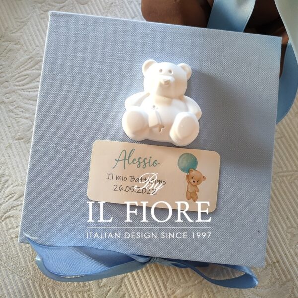 Bomboniera scatola portaconfetti con scomparti e gessetto piedini. Scatola portaconfetti rosa o celeste, con 30 confetti alla mandorla. La scatola fuori è decorata con orsetto e tag adesiva con nome e data cerimonia e nastro di raso rosa o celeste.