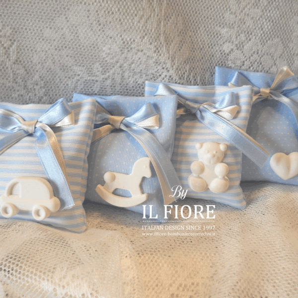Bomboniera per Battesimo sacchetto quadrato, fiocchi e gessetti profumati. Per maschietto anche con gessetto macchinina.
