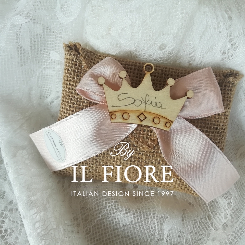 Bomboniera per Battesimo sacchetto bustina portaconfetti juta con corona calamita e fiocchi di raso rosa o celeste, personalizzabile con nome.