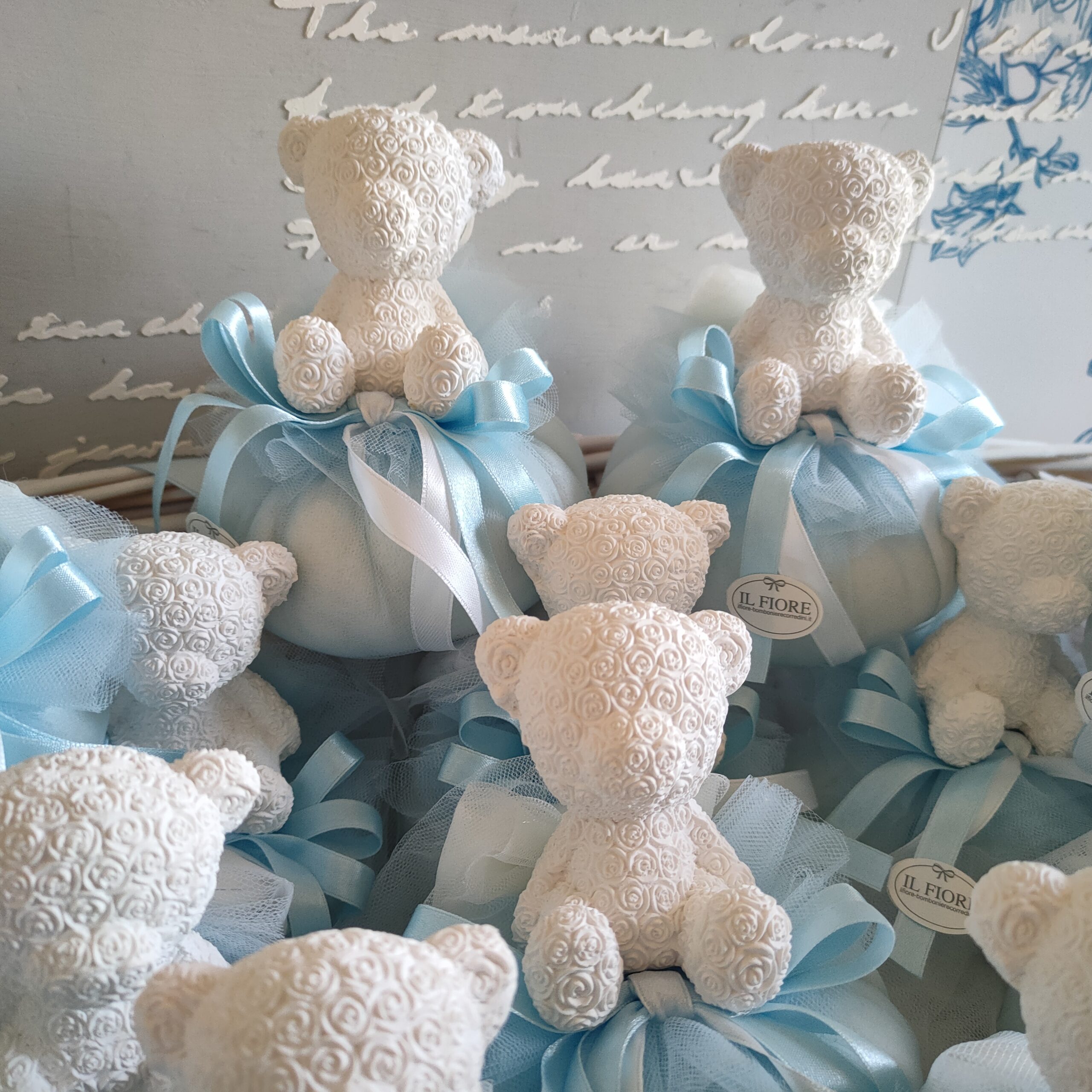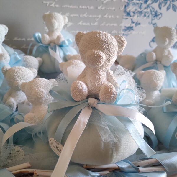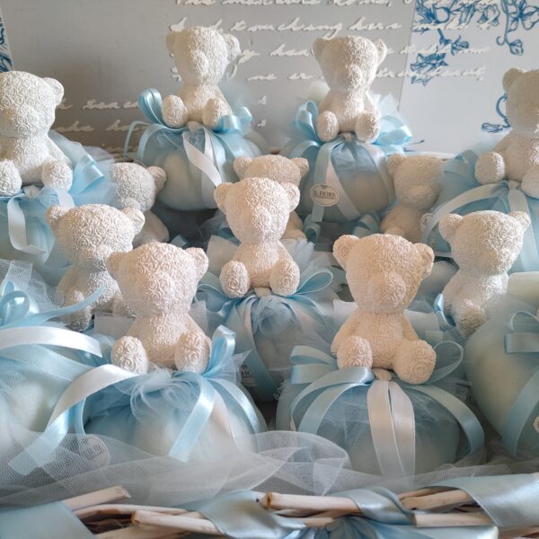 Bomboniera Battesimo pouf in tulle celeste con orso in gesso profumato, nastri di raso. Bomboniera disponibile in rosa, celeste e bianco.