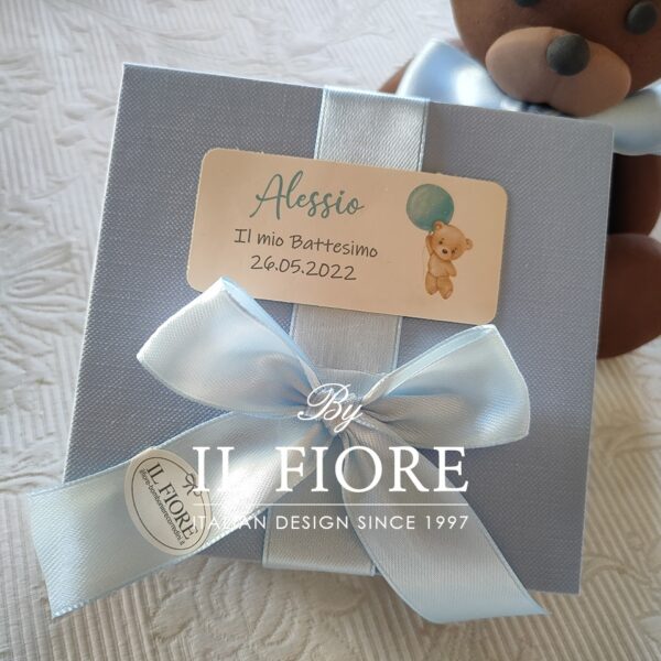 Bomboniera scatola portaconfetti con confetti decorati. La scatola portaconfetti è disponibile in rosa e celeste. La scatola fuori è decorata con tag adesiva con nome e data cerimonia e nastro di raso rosa o celeste.