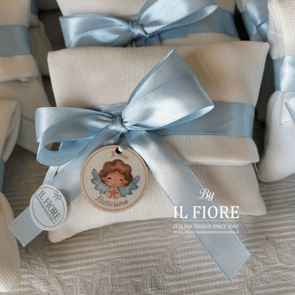 Bomboniera per Battesimo bimbo. Bomboniera sacchetto decorato con nastro di raso e tag in legno con calamita il mio Battesimo.