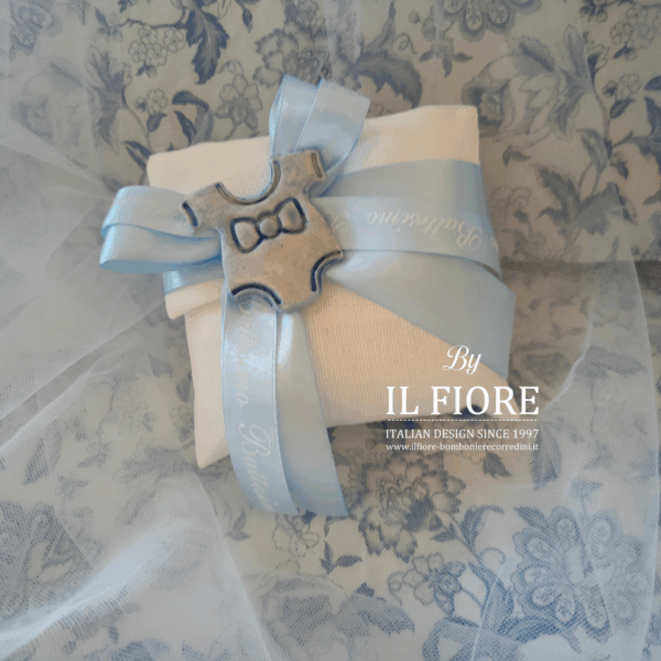 Bomboniera per Battesimo bimbo/bimba. Bomboniera sacchetto decorato con nastro di raso e calamita body.