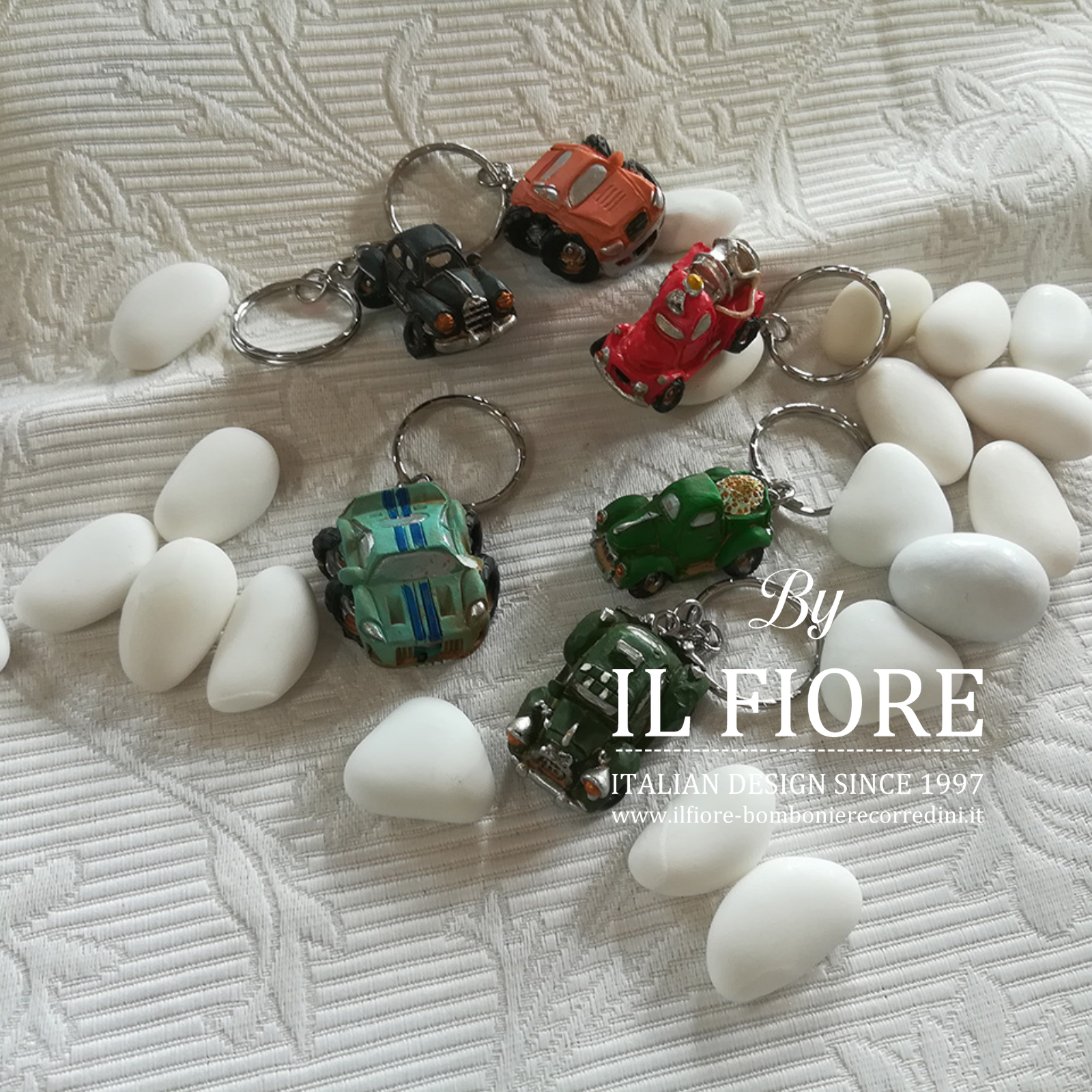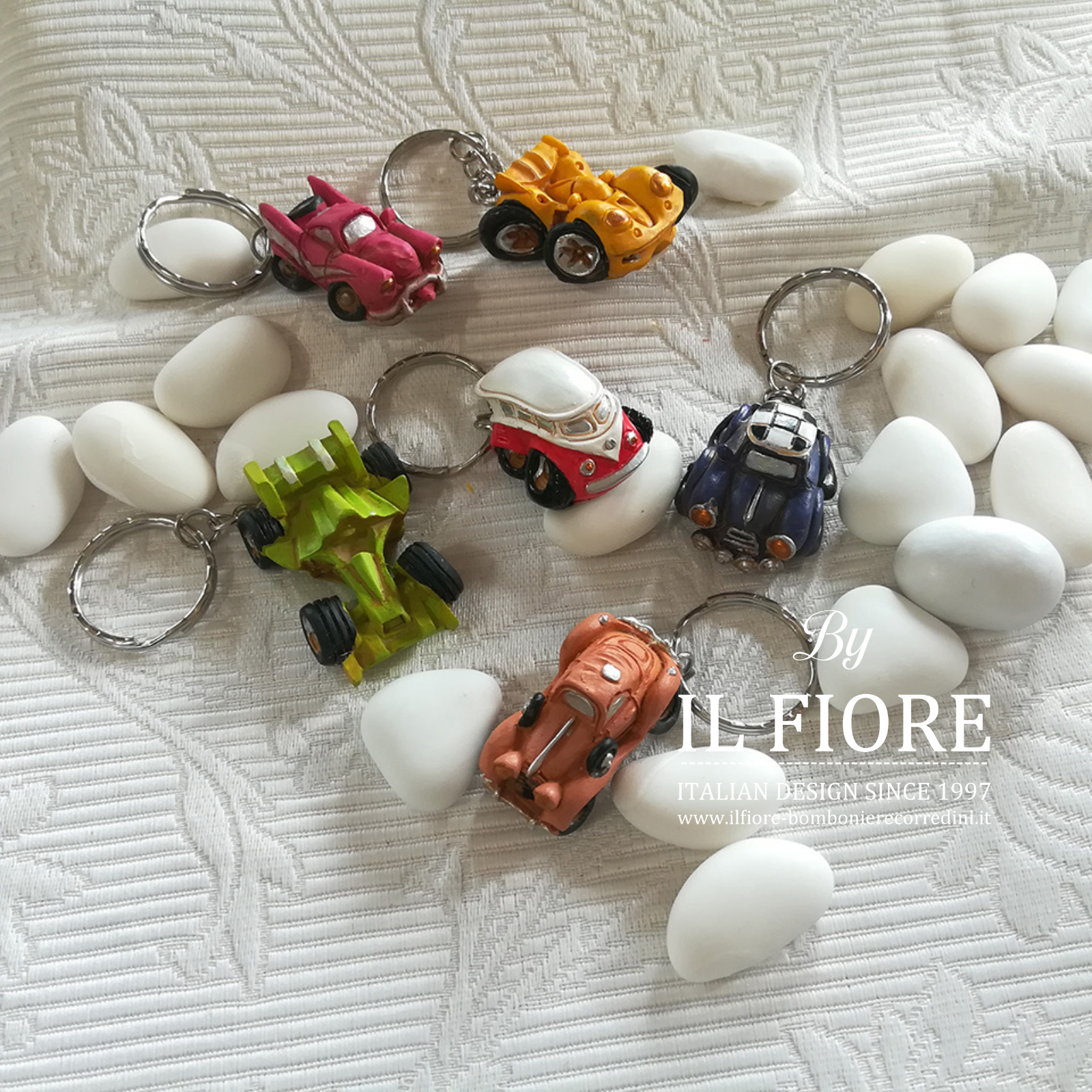 La bomboniera  è confezionata con 12 modelli di macchinine portachiavi .