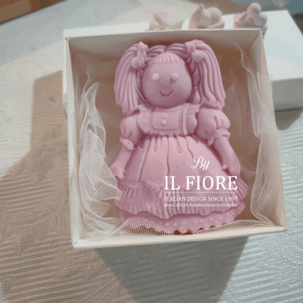 Bomboniera candela decorativa bambolina. La bomboniera è confezionata con scatola .