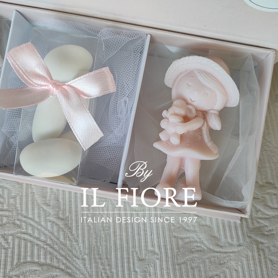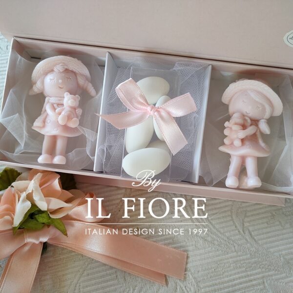 Bomboniera candele decorative bamboline con orsetto. La bomboniera è confezionata con 2 candele rosa e 5 confetti alla mandorla.
