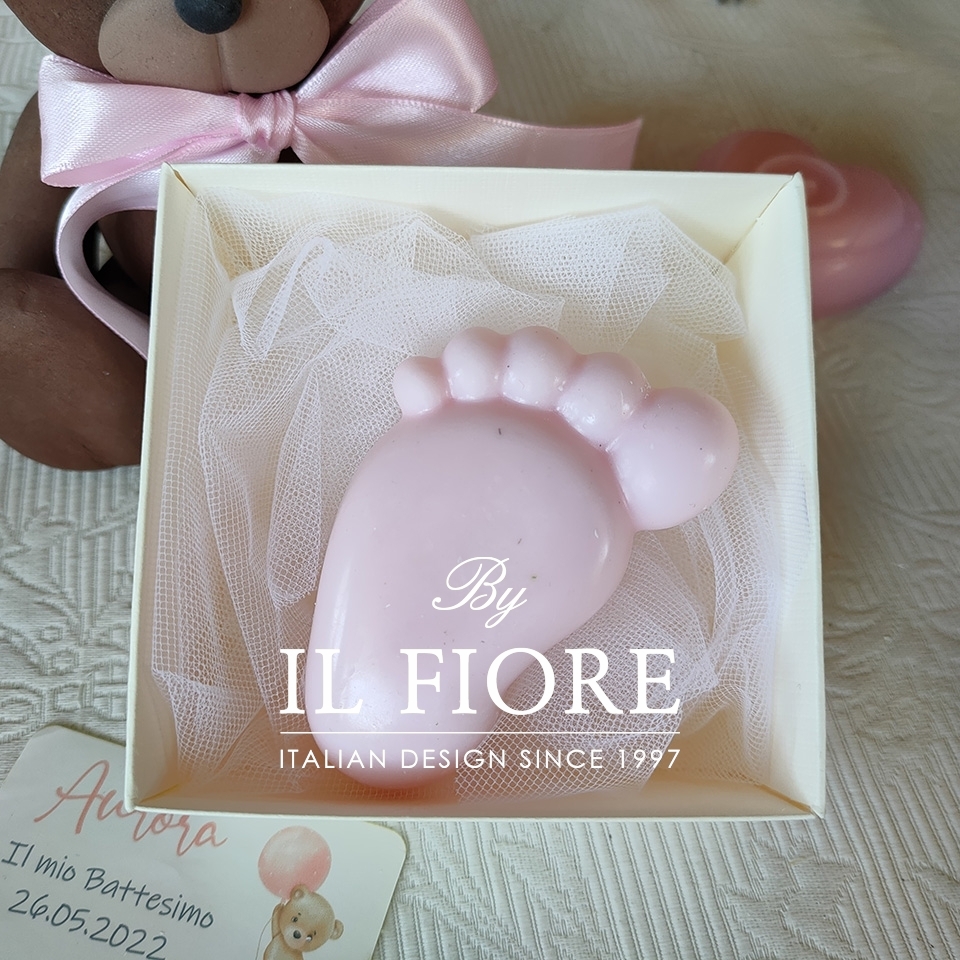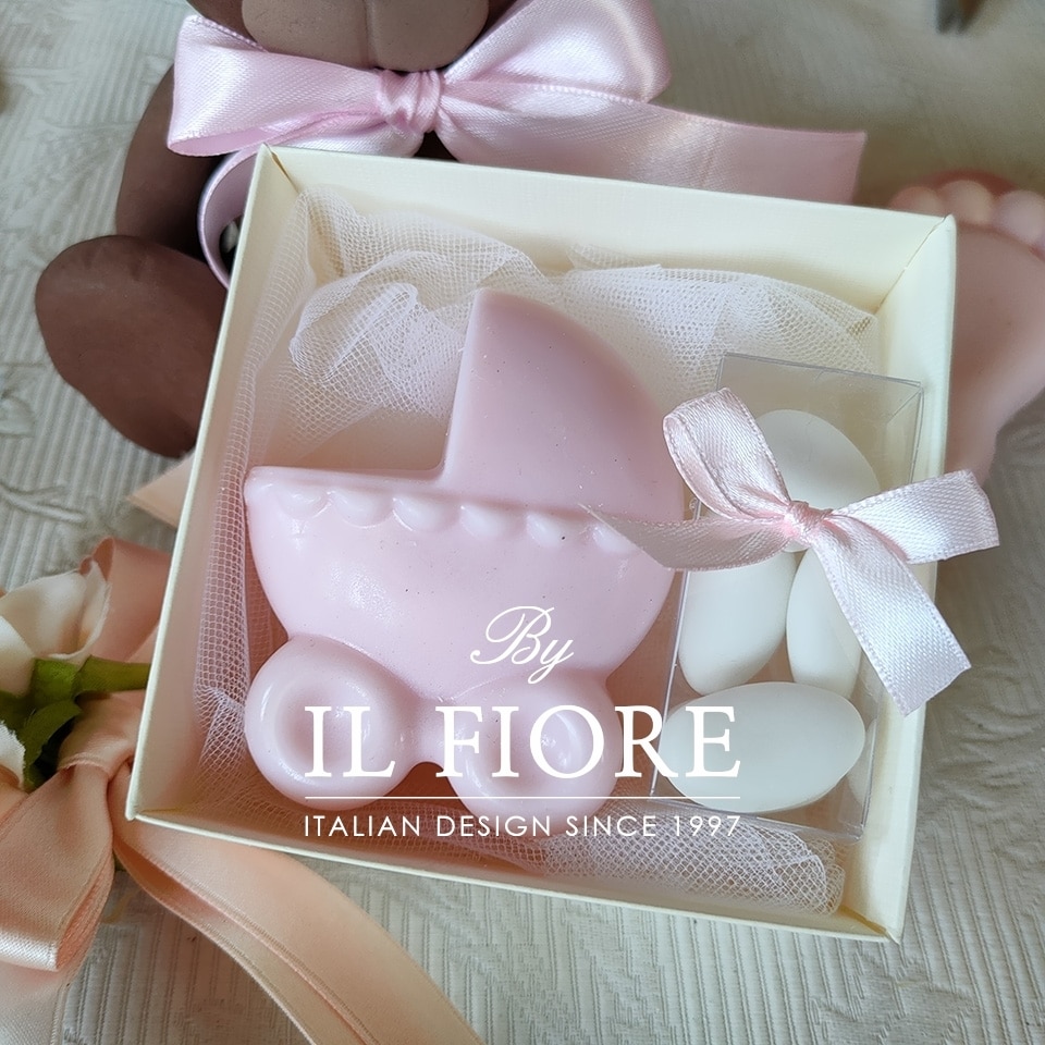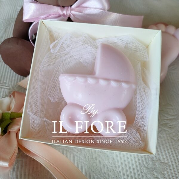 Bomboniera candela decorativa carrozzina, biberon e piedino rosa o celeste. La bomboniera è confezionata con 5 confetti alla mandorla.