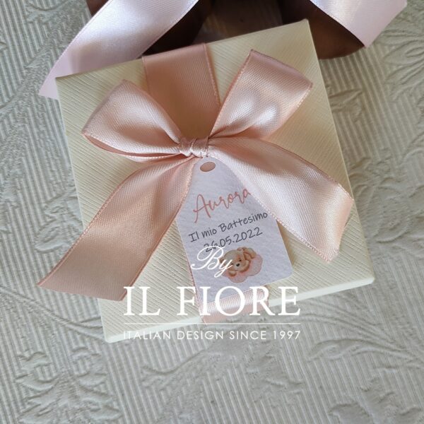 La scatola fuori è decorata con tag stampato il nome, data cerimonia e nastro di raso.