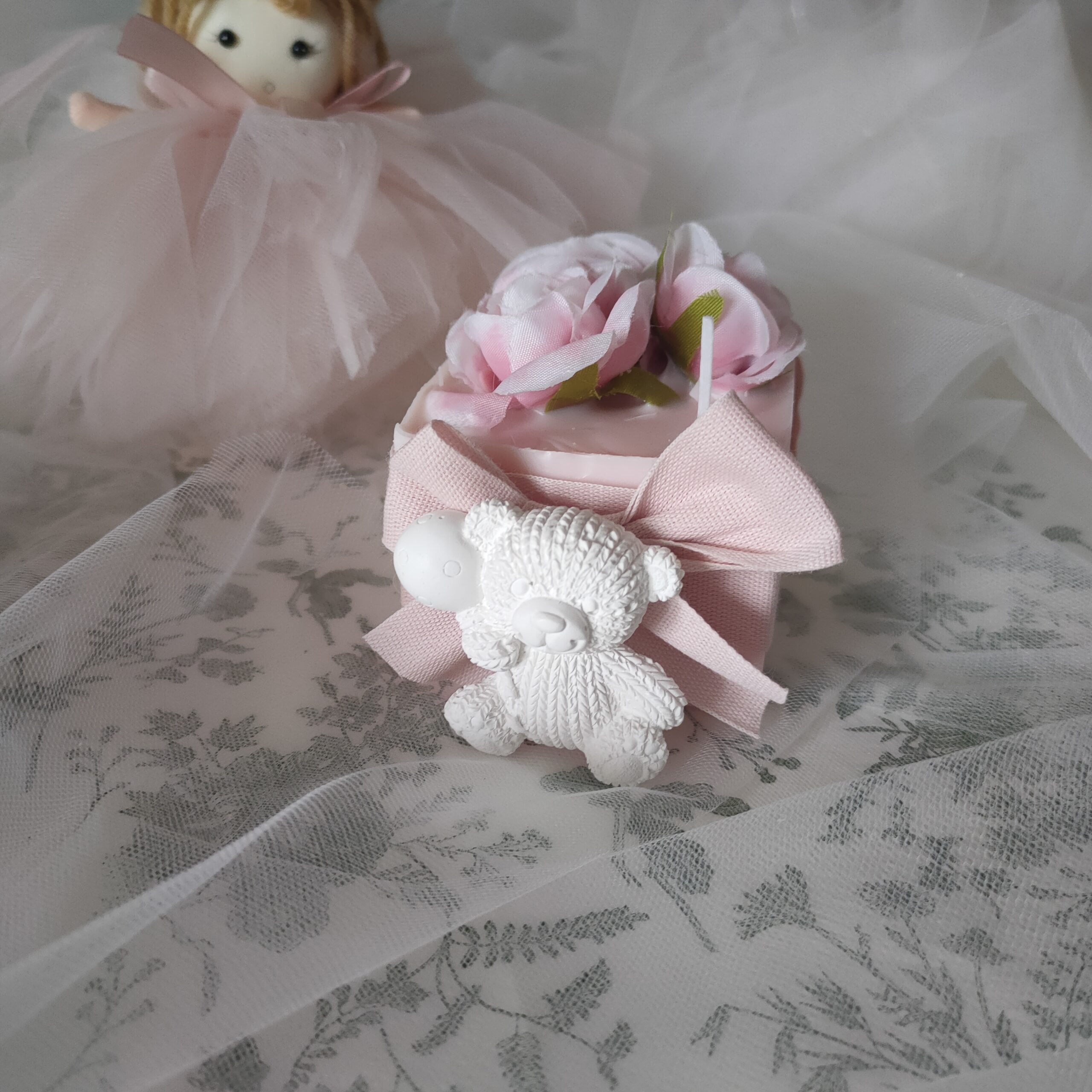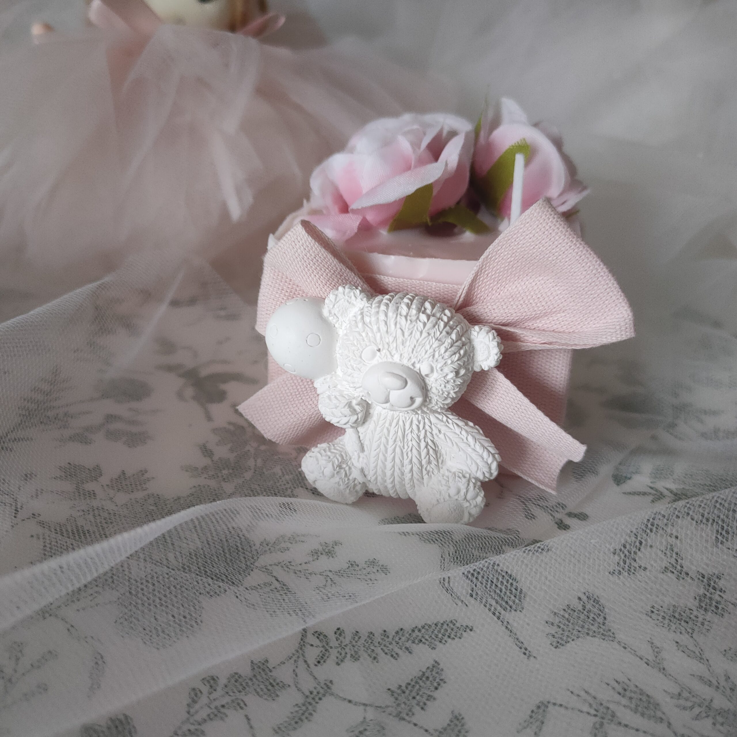 Bomboniera candela con fiori e orsetto rosa o celeste.