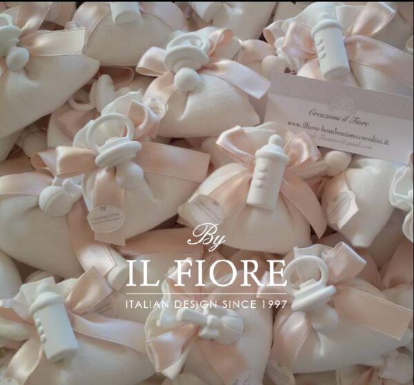 Bomboniera Battesimo Nascita BIMBA E BIMBO, sacchetto portaconfetti in cotone con nastro di raso, e gessetti profumati, ciuccio, biberon e sonaglino.
