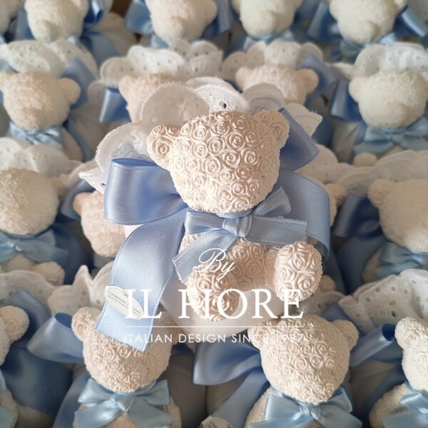 Bomboniera Battesimo con orso e sacchetto con pizzo Sangallo