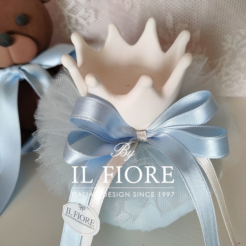 La bomboniera Battesimo Coroncina è confezionata con tulle e doppio fiocco in raso.
