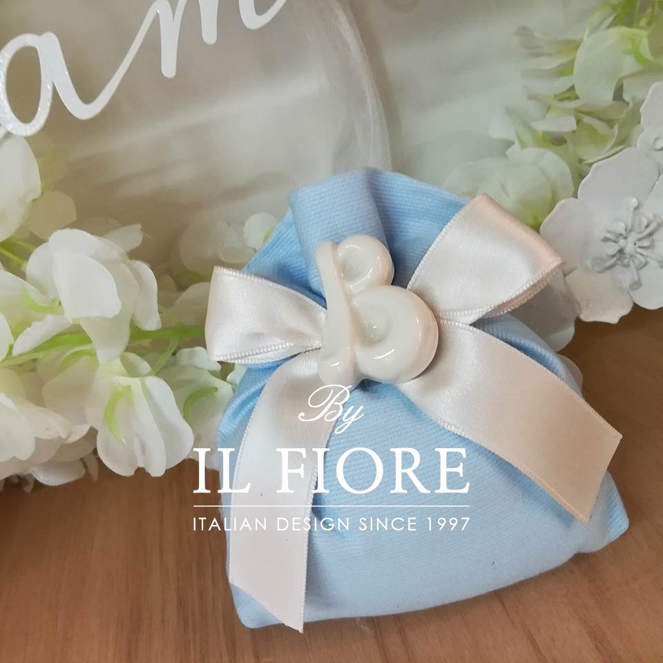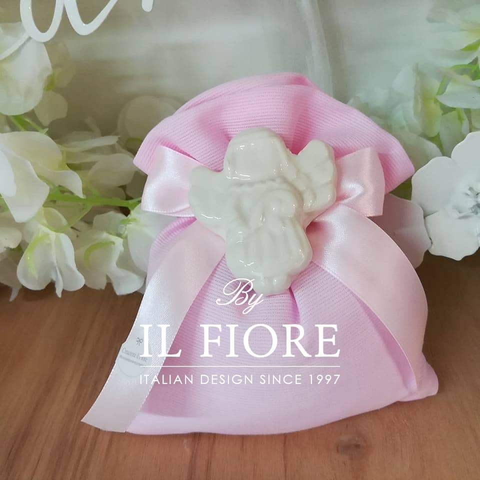 Bomboniera battesimo sacchetto in piquet con nastro di raso e calamita angelo in ceramica bianca.