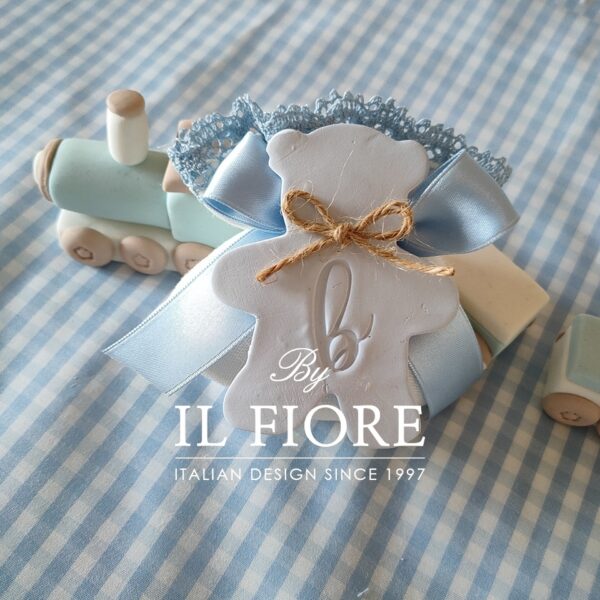 Bomboniera per Battesimo sacchetto bianco con calamita gessetto grezzo profumato a forma di orsetto e lettera personalizzabile di colore celeste o rosa.