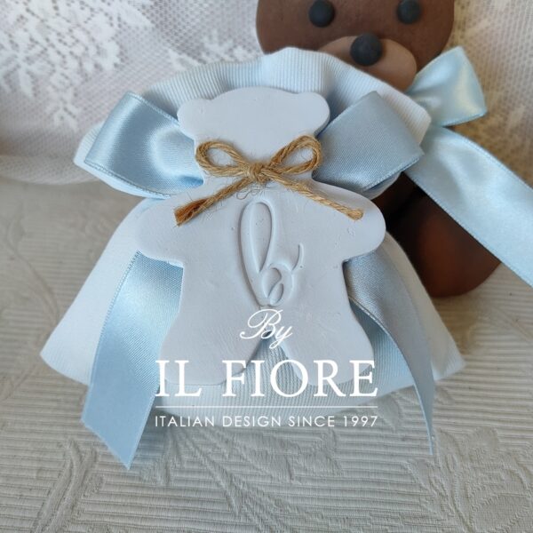 Bomboniera per Battesimo sacchetto con calamita gessetto grezzo profumato a forma di orsetto e lettera personalizzabile di colore celeste o rosa.