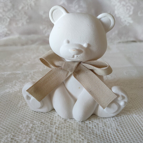 Bomboniera Battesimo orsetto bianco per bimbo e bimba in gesso profumato cm 10×10. L’orsetto essendo profumato ha la funzione di profumatore per ambiente.