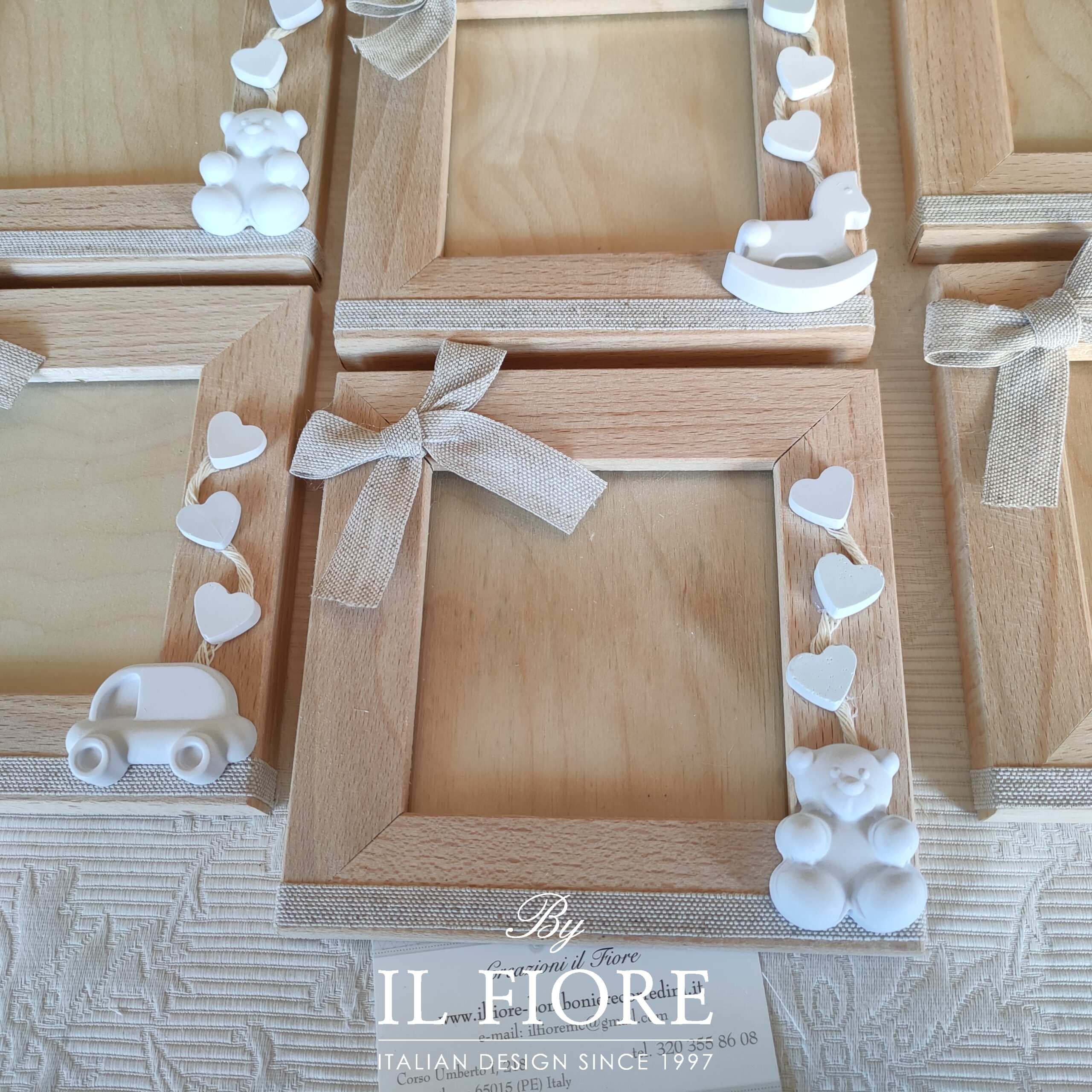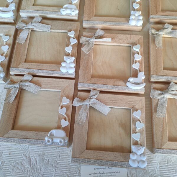 Bomboniera per Battesimo portafoto in legno naturale con gessetti profumati colorati e nastro di cotone grezzo. Nel prezzo sono compresi 5 confetti alla mandorla classica ma si può confezionare, sostituendo i confetti alla mandorla classica con confetti decorati massimo 3 per bomboniera, le decorazioni saranno miste.