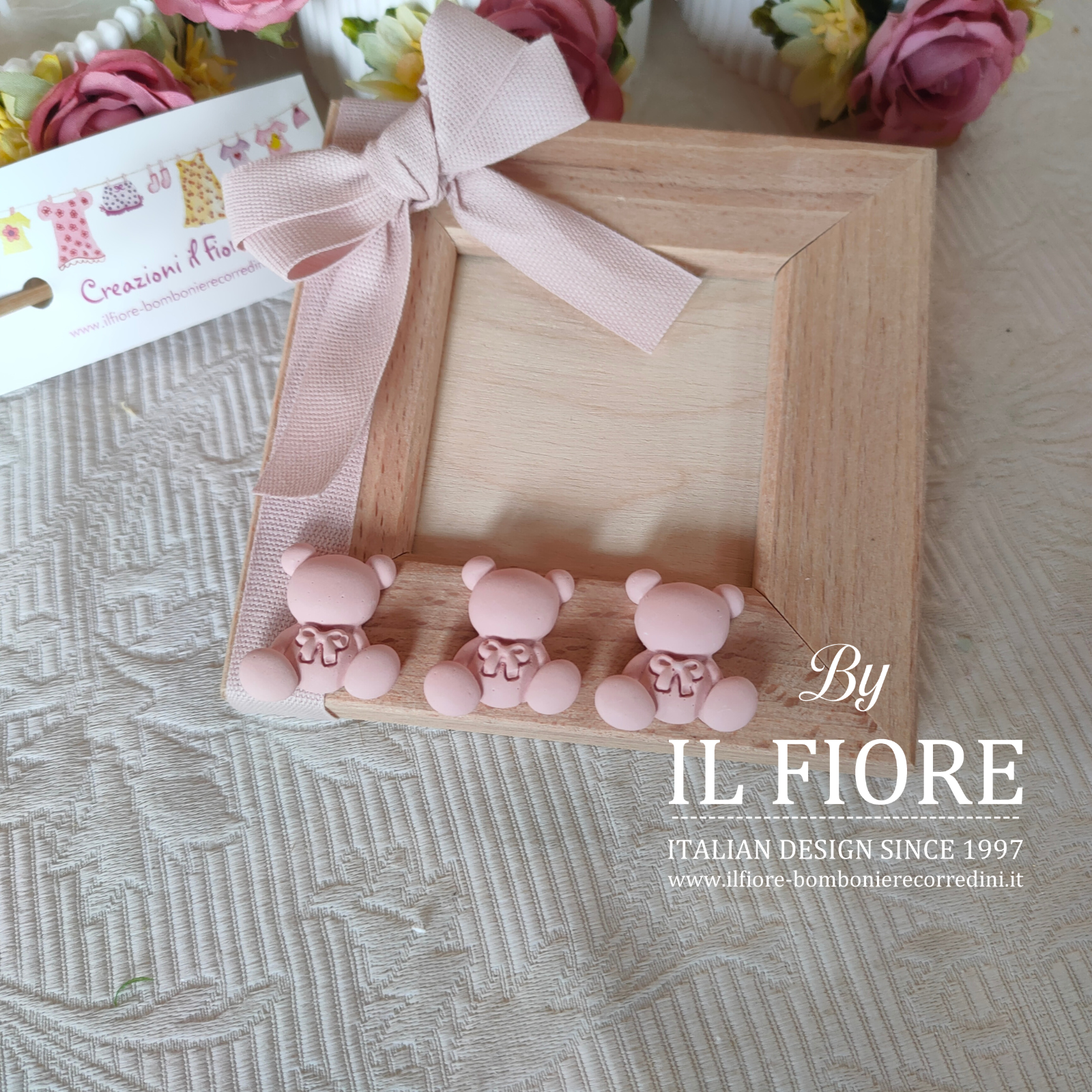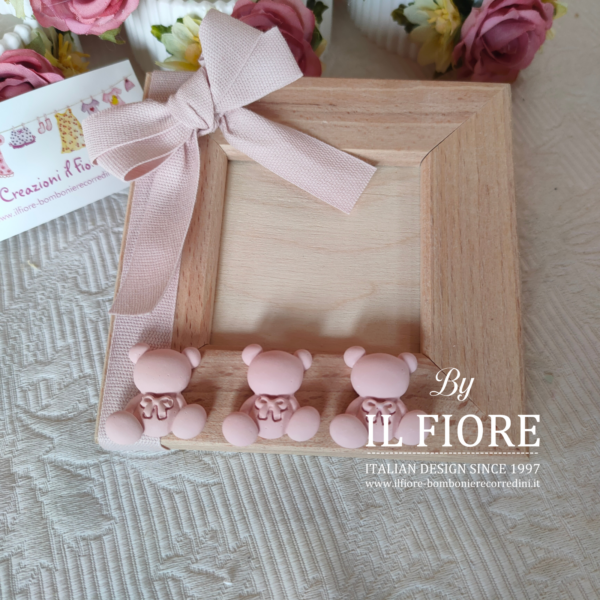 Bomboniera per Battesimo portafoto in legno con gessetti profumati orso di colore rosa o celeste e fiocco.