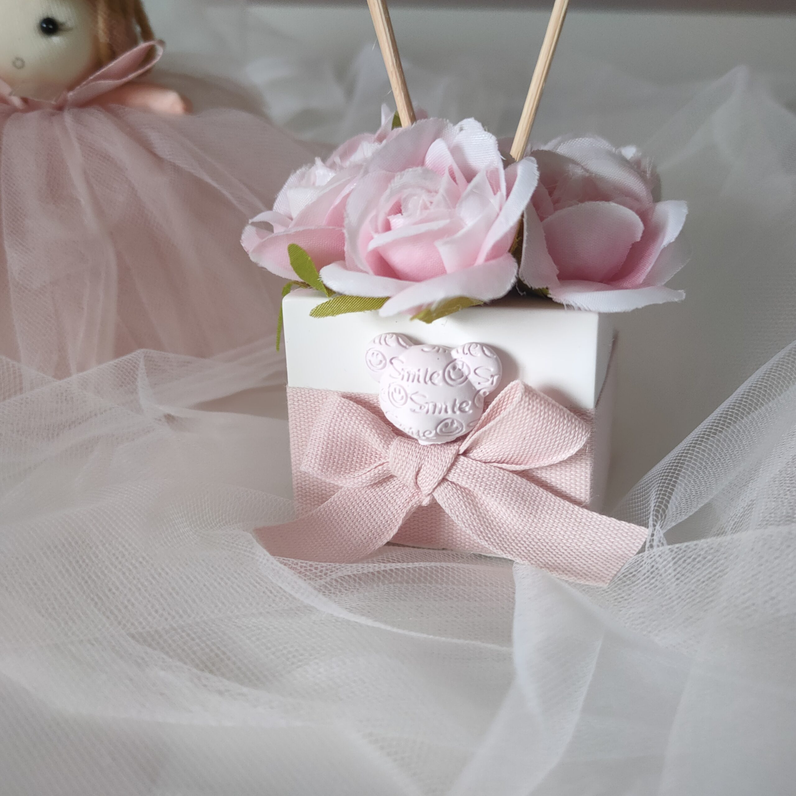 Bomboniera profumatore in gesso con fiori e orsetto rosa o celeste.