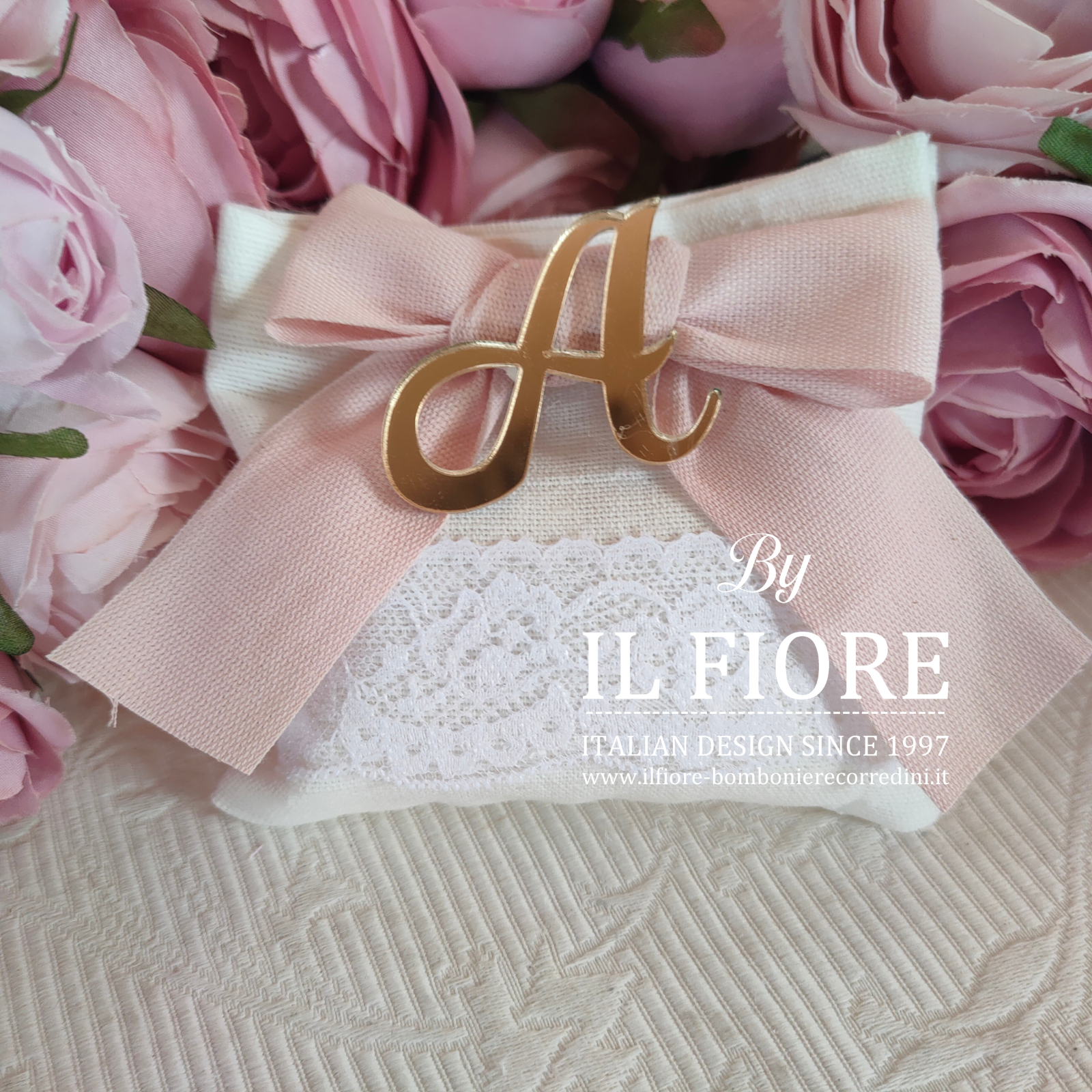 Bomboniera Comunione e Cresima, raffinato sacchetto portaconfetti con pizzo e decorato con lettera dorata personalizzabile.