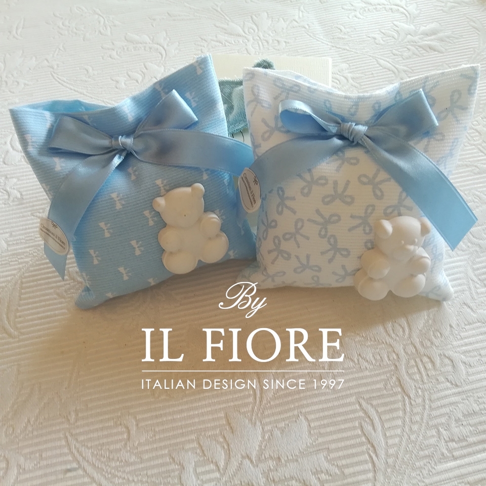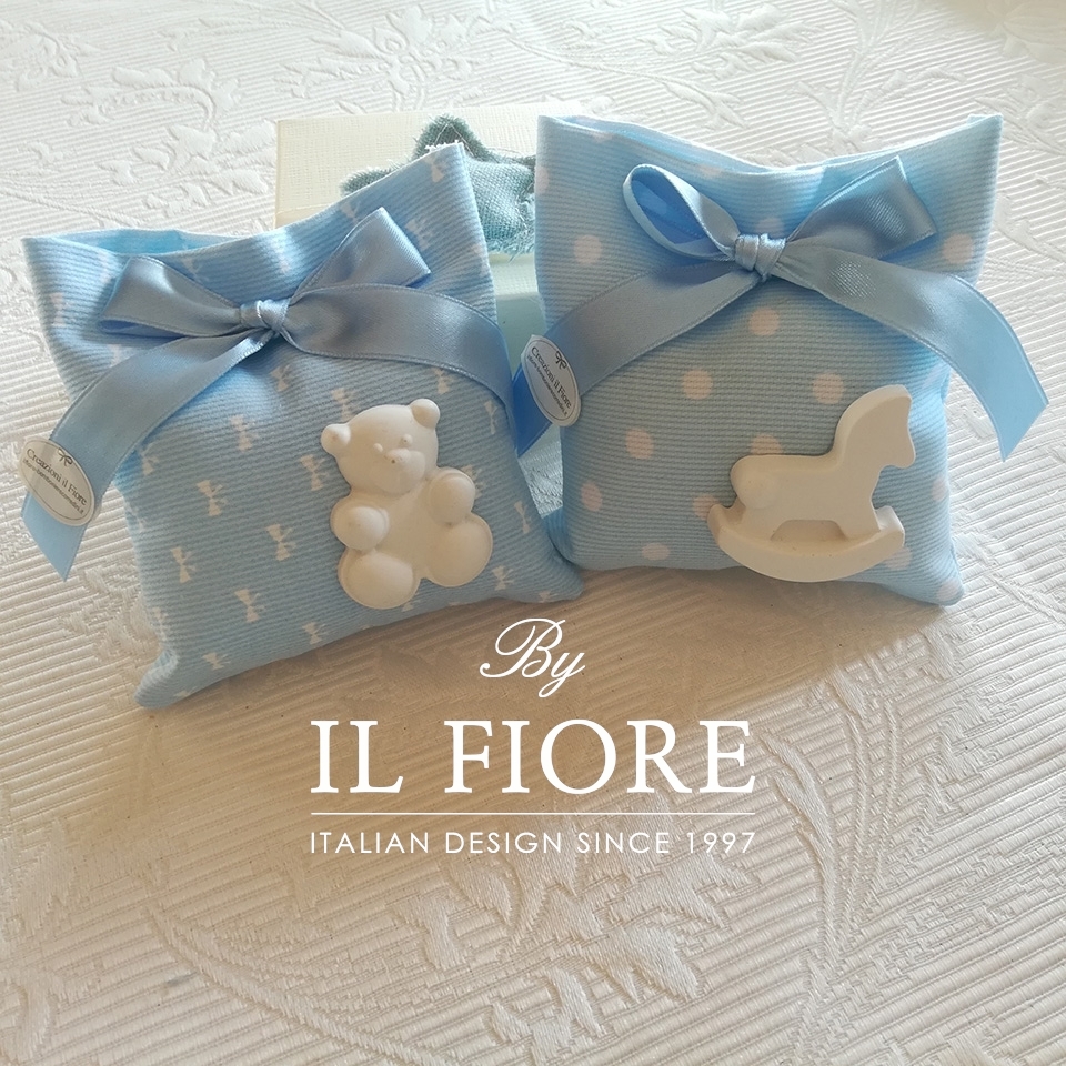 Disponibile anche con nastro e sacchetto color rosa per bambina. Misura sacchetto quadrato 14×14.
