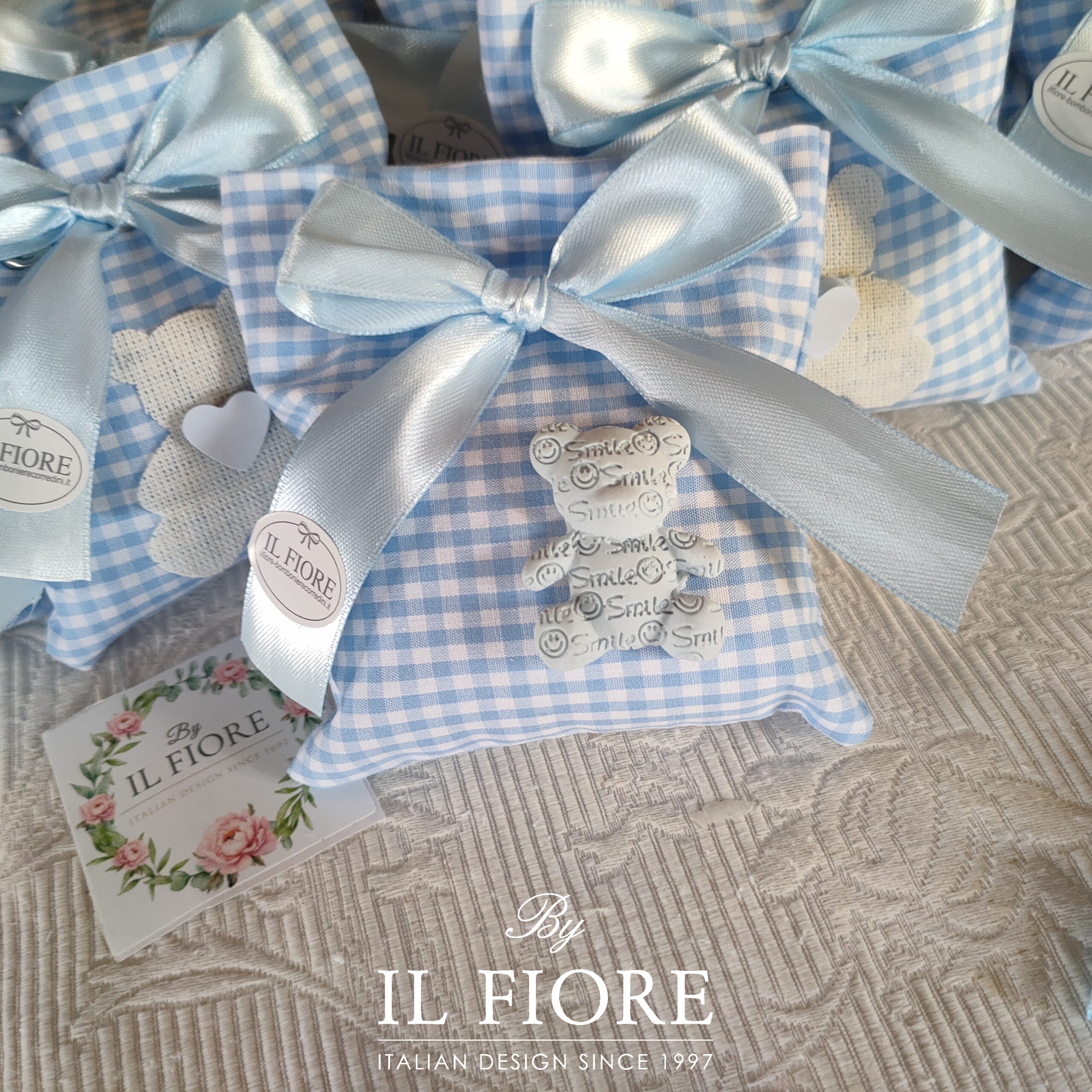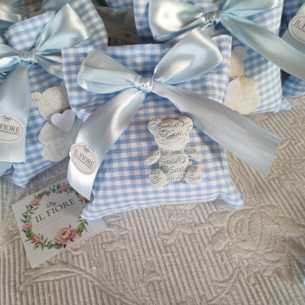 Bomboniera per Battesimo sacchetto a quadretti con orsetto in gesso.