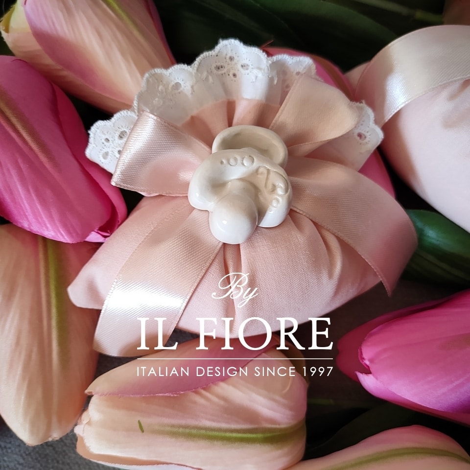 Bomboniera Battesimo sacchetto classico rosa o celeste con pizzo Sangallo, decorata con calamita biberon, ciuccio e pidino in gesso profumato.