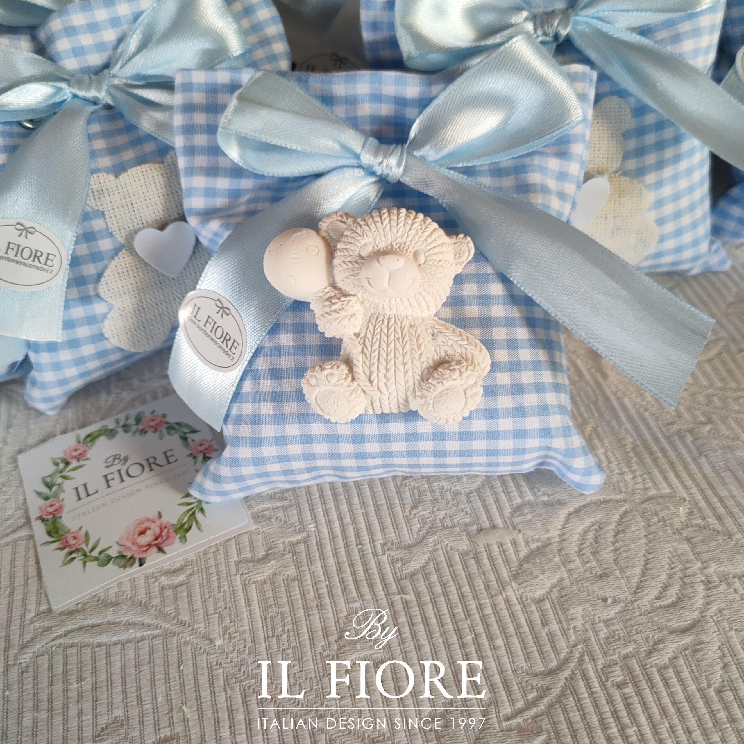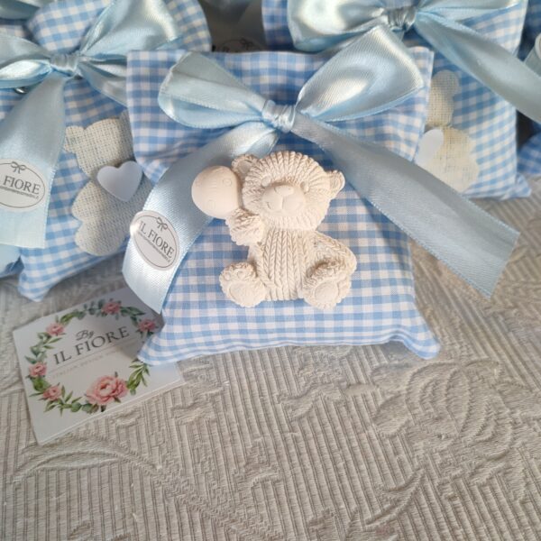 Bomboniera per Battesimo sacchetto a quadretti con orsetto in gesso con palloncino.