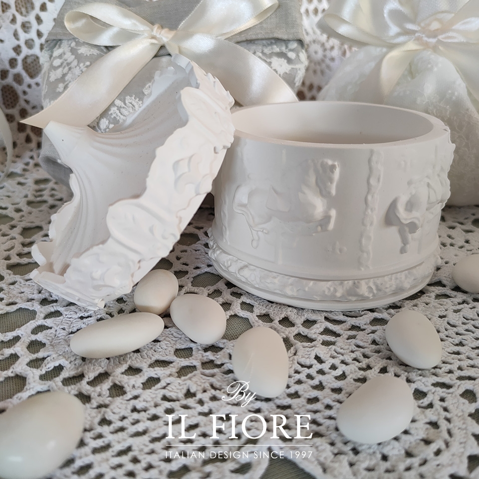 Bomboniera Battesimo scatola giostrina in gesso con candela per bimba e bimbo.
