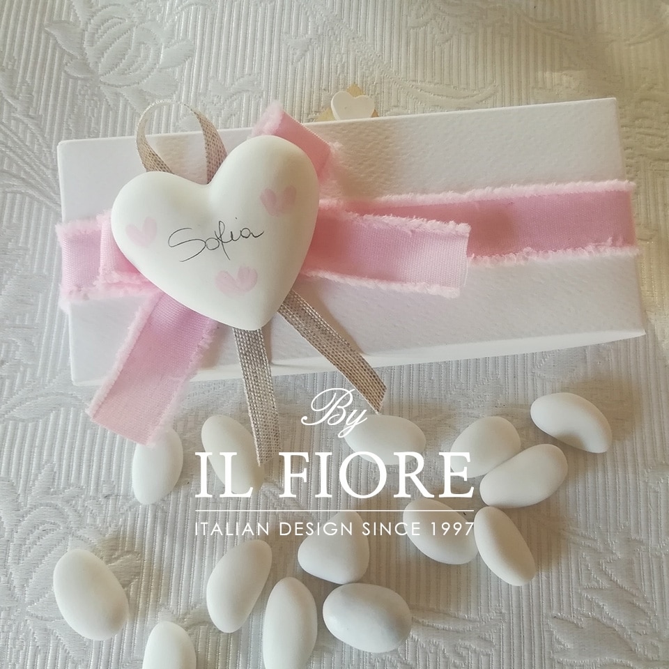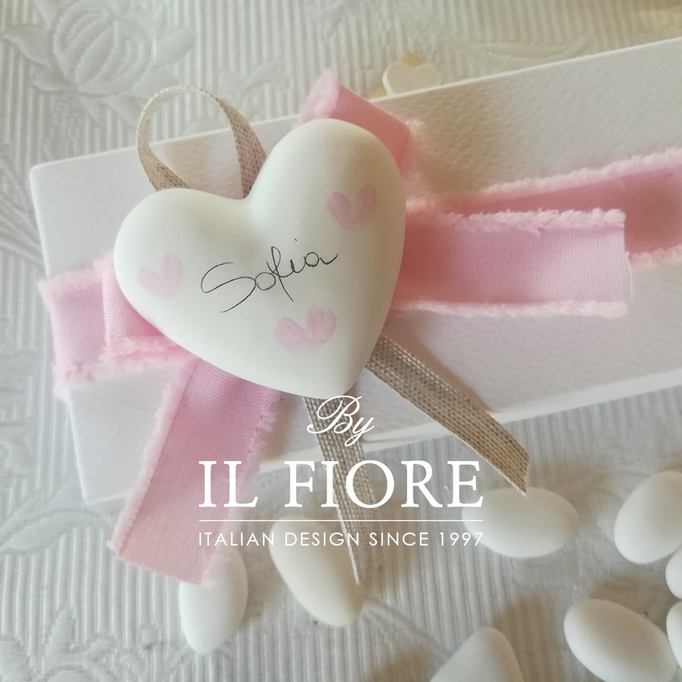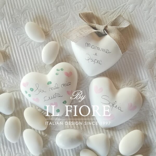 Bomboniera Battesimo Scatola portaconfetti Battesimo bimbo e bimba, con cuore decorato a mano in gesso profumatissimo. Il cuore si può personalizzare come foto dimostrativa.