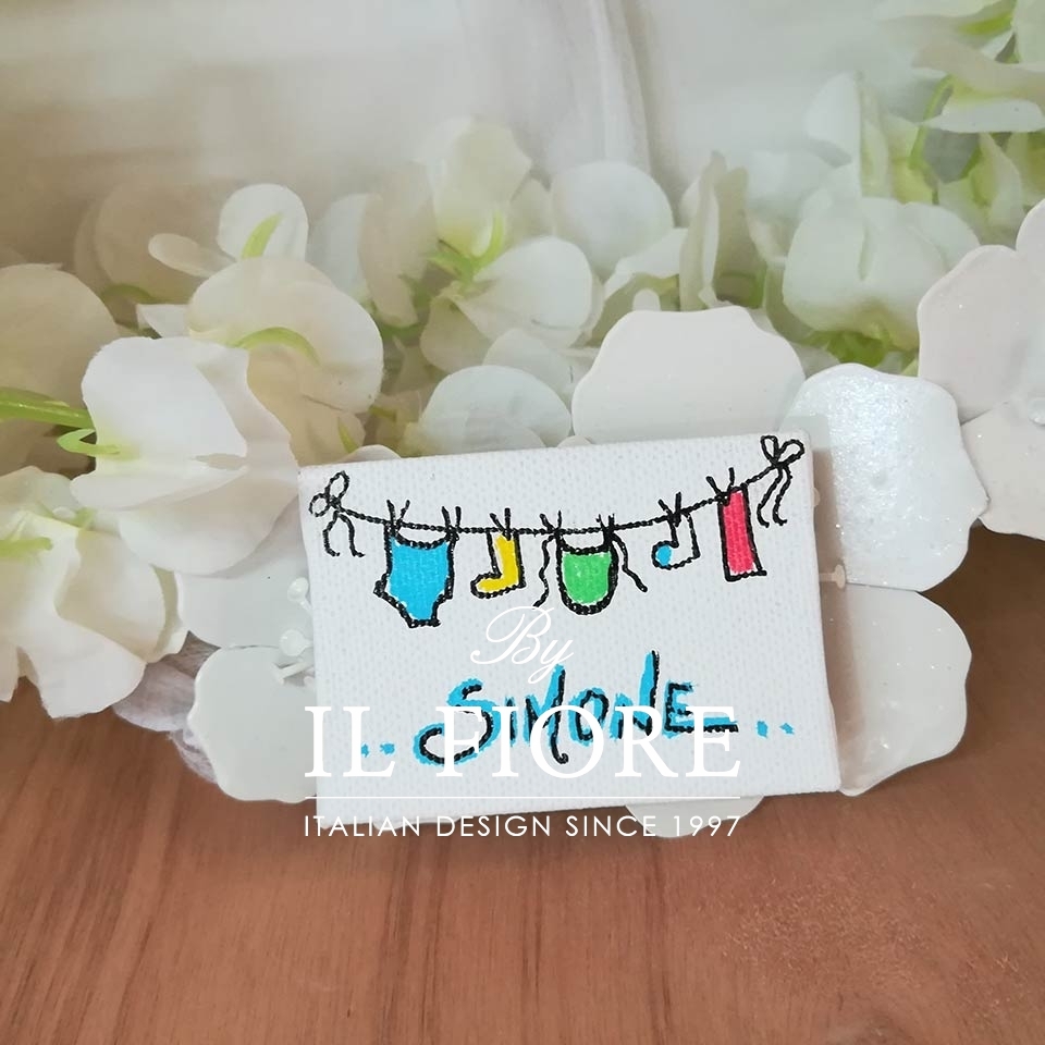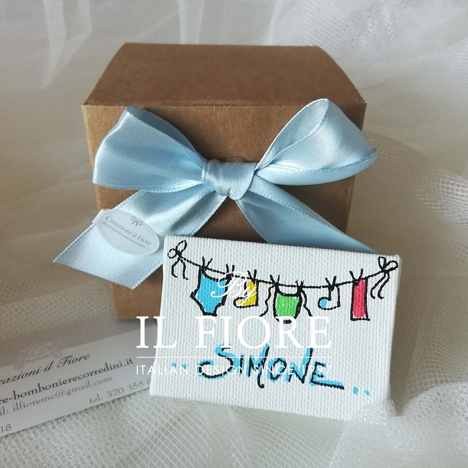 Bomboniera Battesimo tela dipinta a mano con nome e calamita.