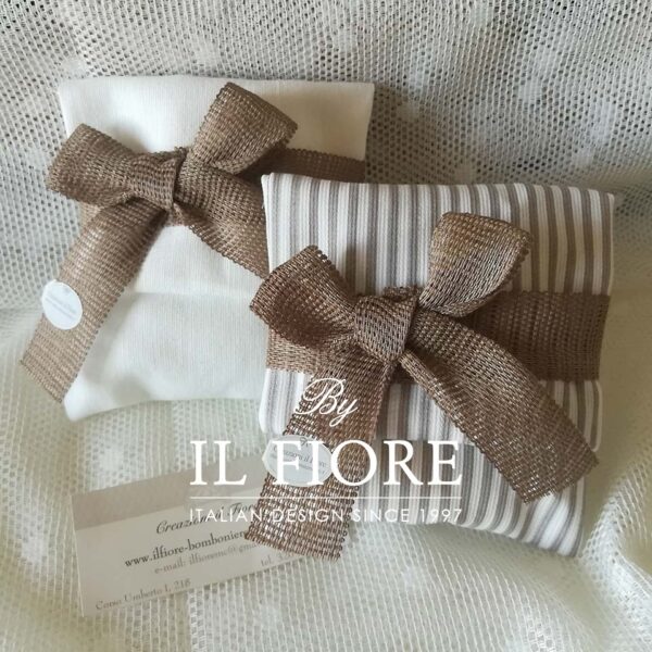 Bomboniera busta Shirley della linea Creazione Basic in cotone la busta bianca, la busta a righe in piquet. Decorazione a chiusura della bomboniera fiocco color tortora in lino.