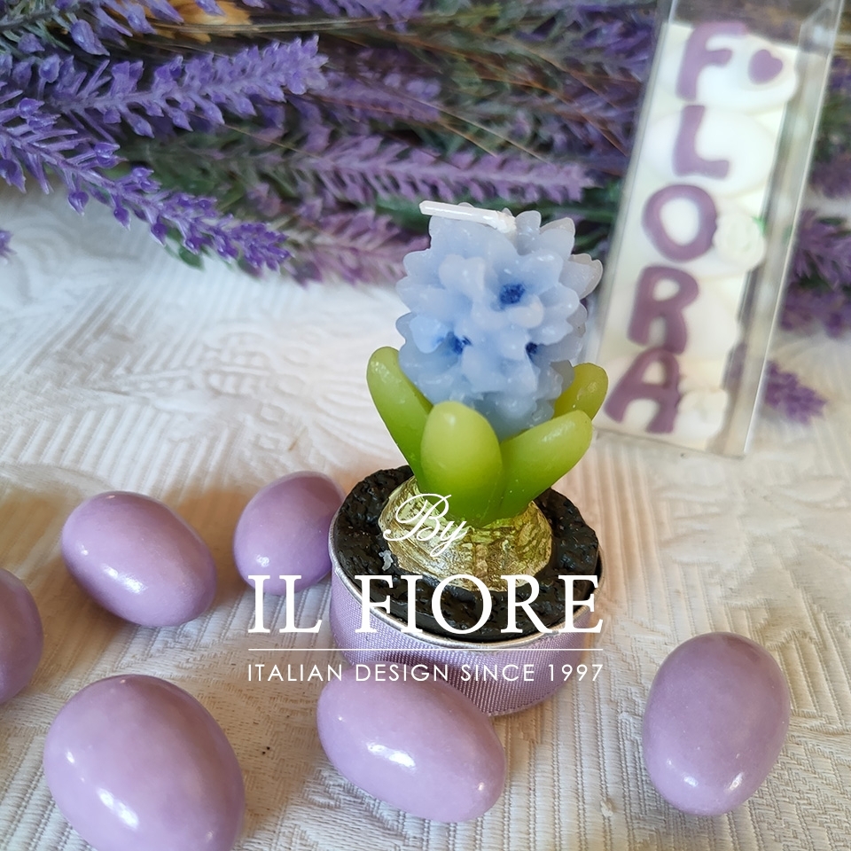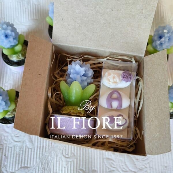 Bomboniera Comunione. Cresima, matrimonio e anniversario matrimonio, candela lavanda. La bomboniera confezionata con scatola, fiocco e tag con nome e data, all’interno saranno inseriti i confetti decorati con l’iniziale del nome.
