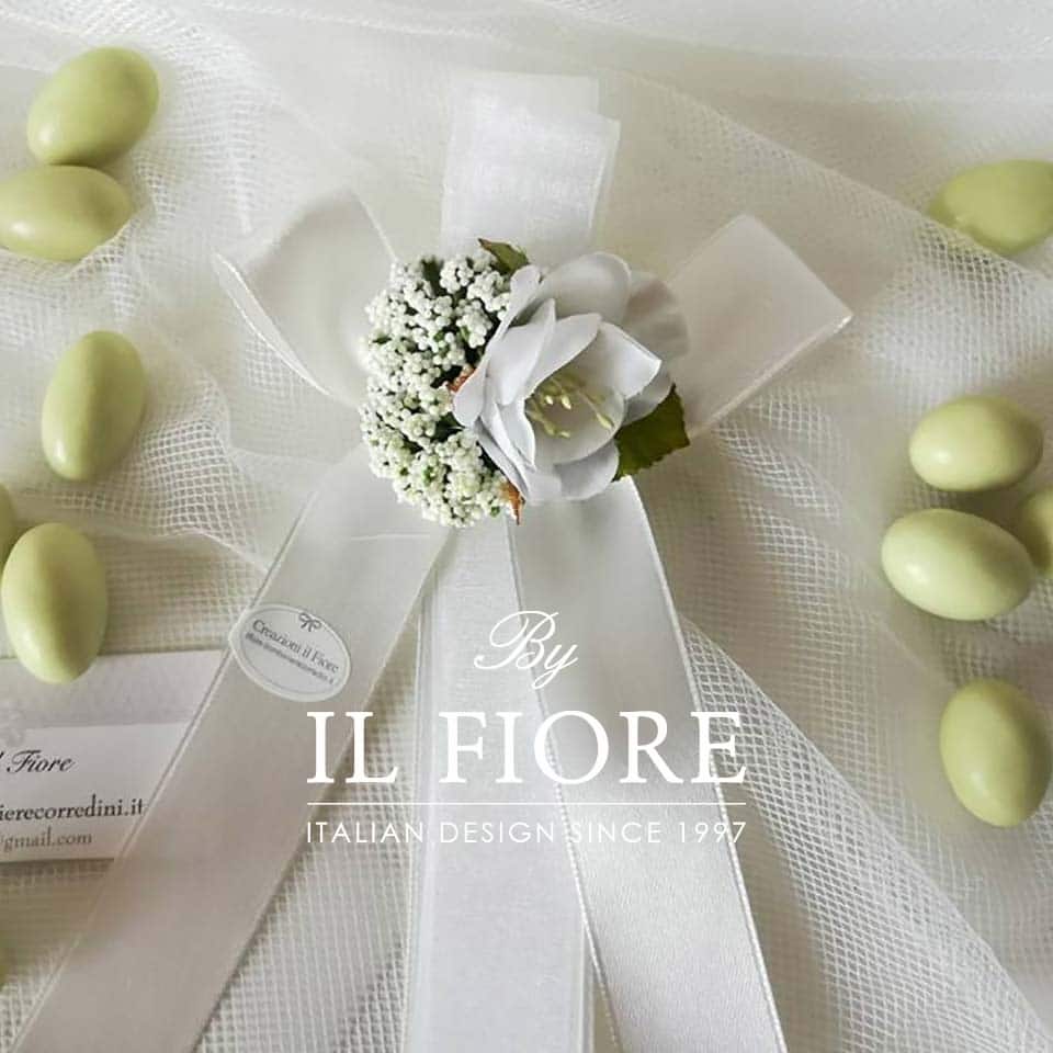 Bomboniera matrimonio ciuffetto elegante con fiori, nastri in raso e organza.
