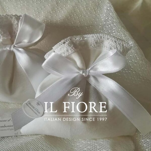 Bomboniera classica Josslyn della linea Creazione Basic in cotone con merletto. Decorazione fiocco in raso color bianco. I colori dei nastri si possono cambiare.