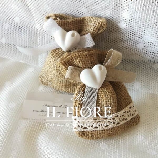 Bomboniera classica in juta con merletto e nastro grezzo. Gessetto profumato a forma di cuore.