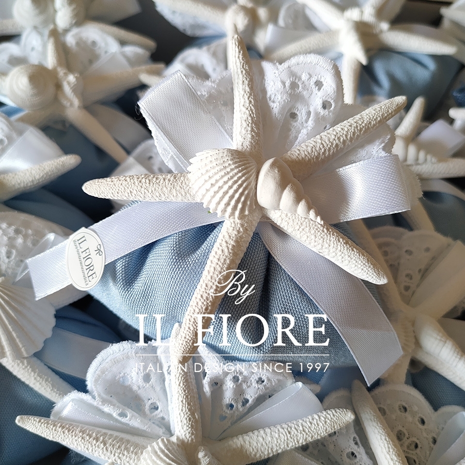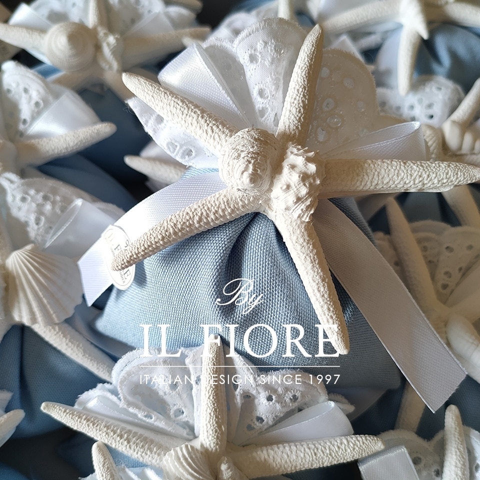 Bomboniera classica in tessuto colore azzurro polvere e pizzo san gallo, nastri di raso colore bianco, decorazioni Stella Marina e conchiglie in gesso di colore bianco profumatissimi.