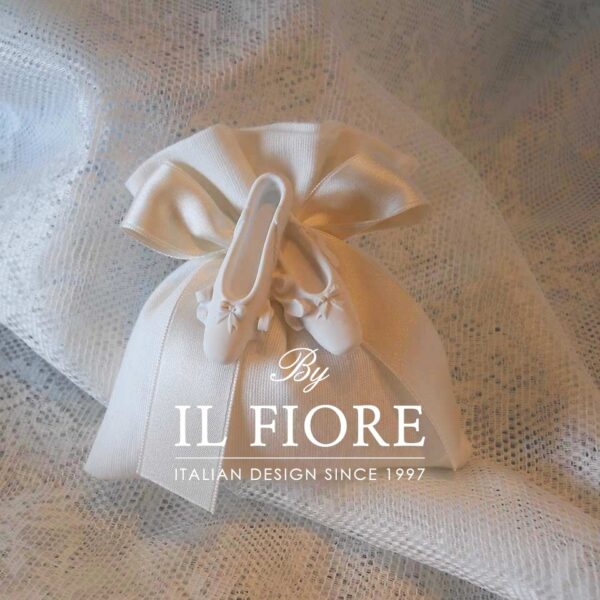 Bomboniera Cresima, Comunione è realizzata in tessuto cotone con fiocco in raso color avorio e gessetto profumato scarpette mezze punte danza classica.