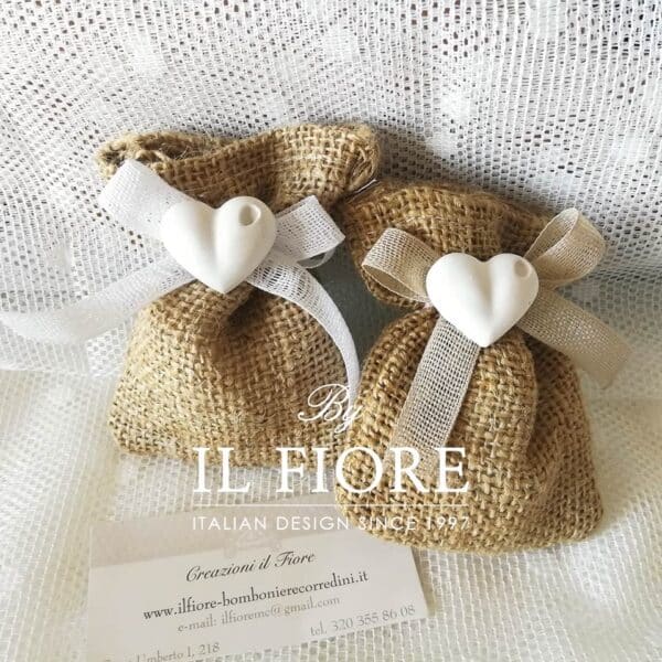 Bomboniera classica in Juta con gessetto profumato a forma di cuore, nastro grezzo.