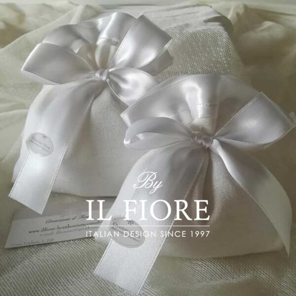 Bomboniera classica Verdiana della linea Creazione Basic in cotone con bordo in raso bianco. Decorazione fiocco in raso color bianco. I colori dei nastri si possono cambiare.