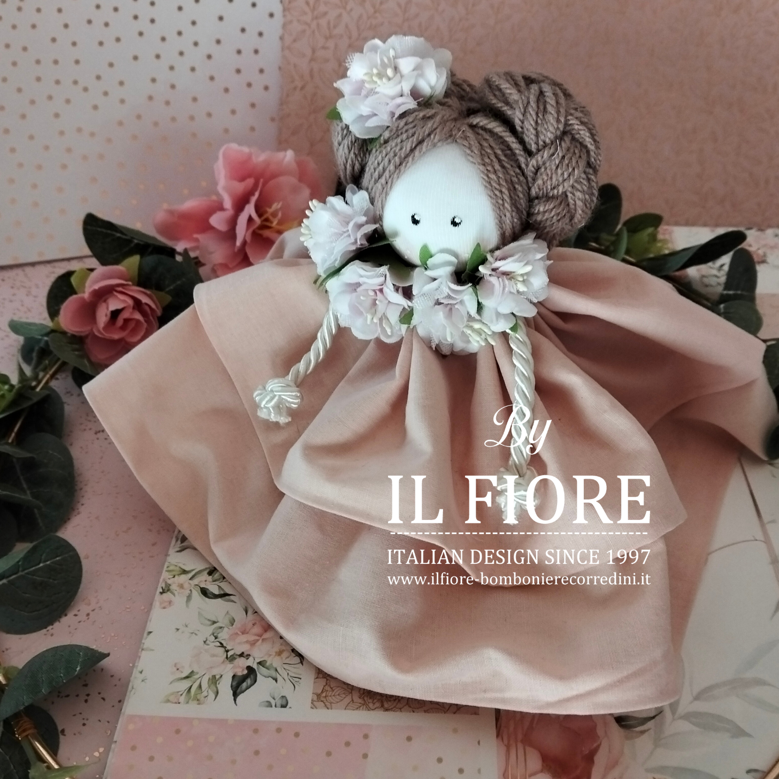 Bomboniera bambola con vestito rosa e fiorellini ideale per Comunione e Cresima. Confezionata con busta , tag personalizzata con nome e data cerimonia.