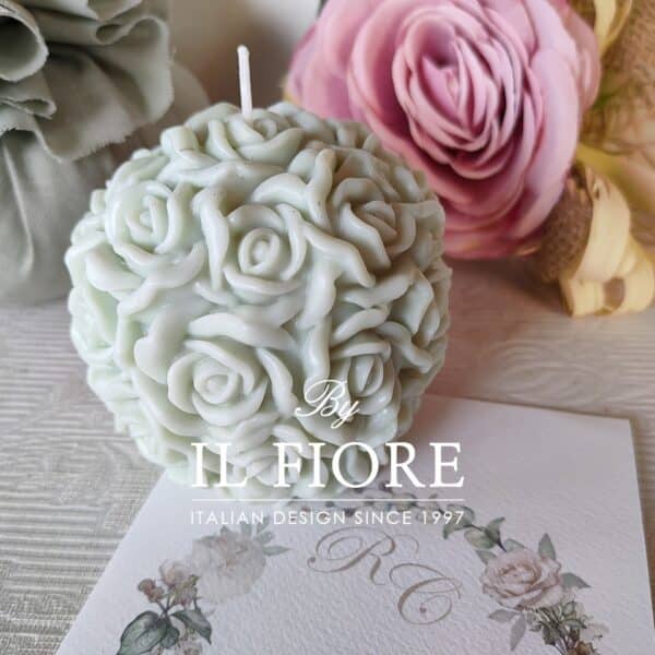 Bomboniera candela grande con Roselline rosa verde salvia. Disponibile nei colori: bianco, rosa e tortora.