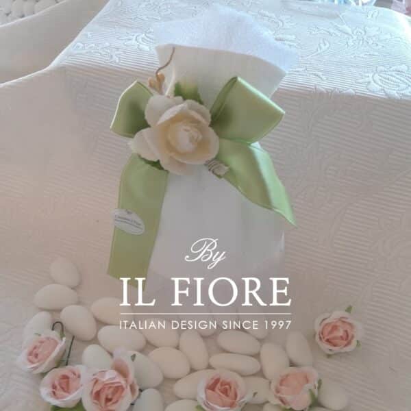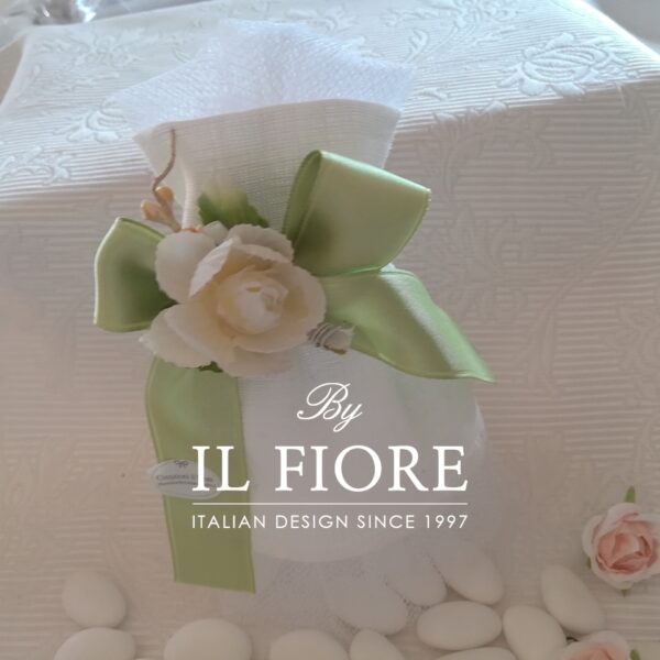 Nella bomboniera è compresa la confezione con sacchetto in organza, ciuffetto e biglietto in omaggio.