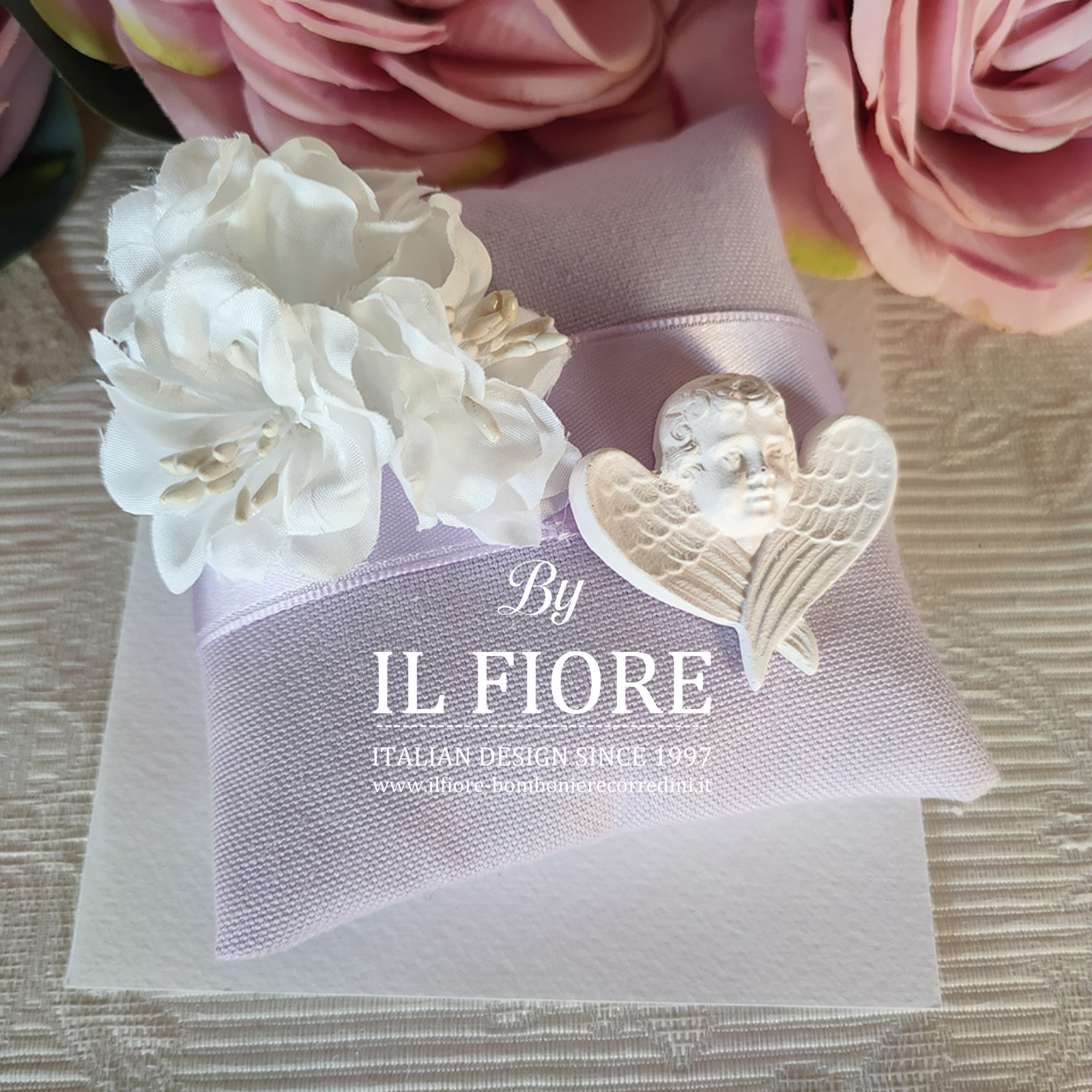 Bomboniera Comunione, Cresima, CUSCINO provenzale decorato con angelo e fiori. Confezionata con scatola e nastro.